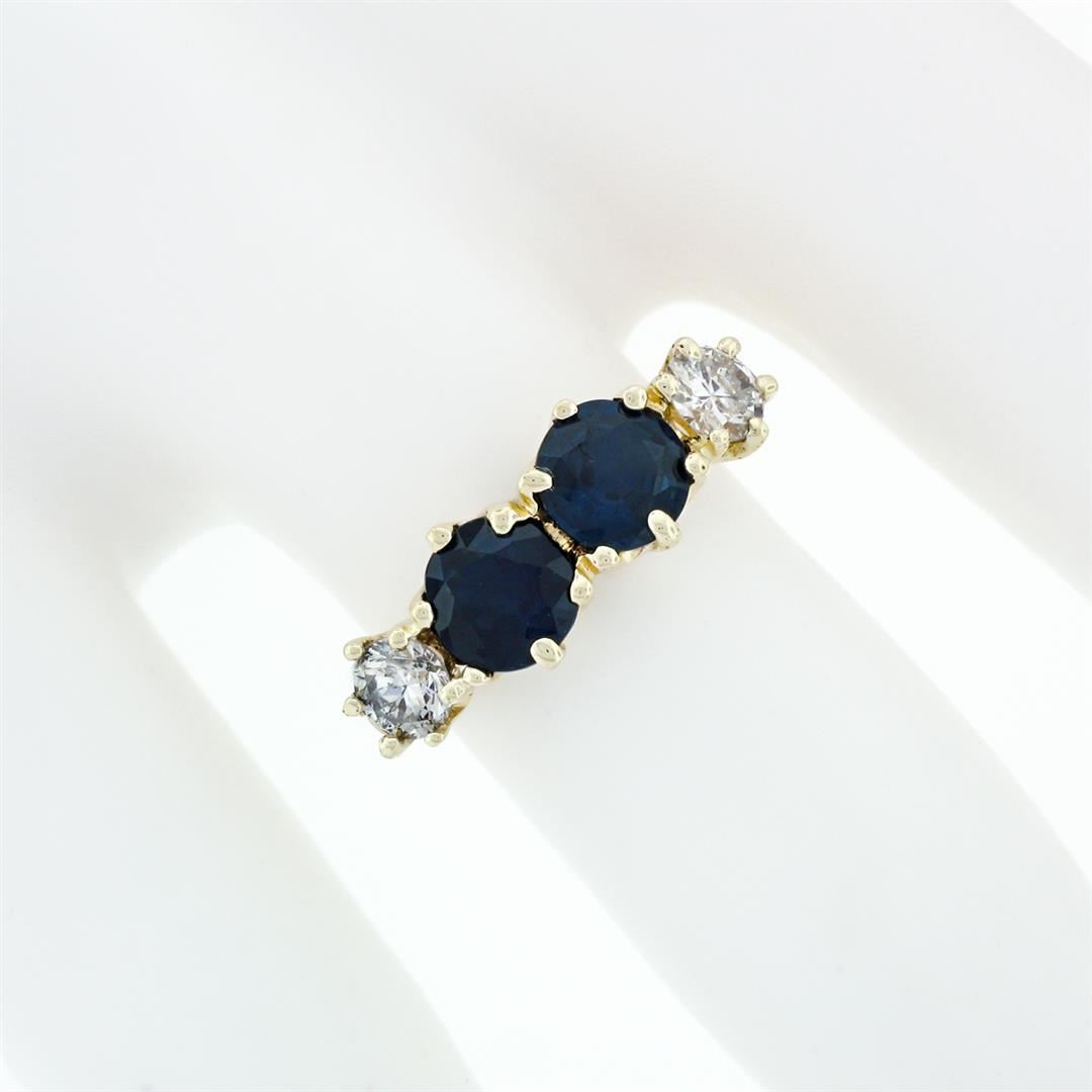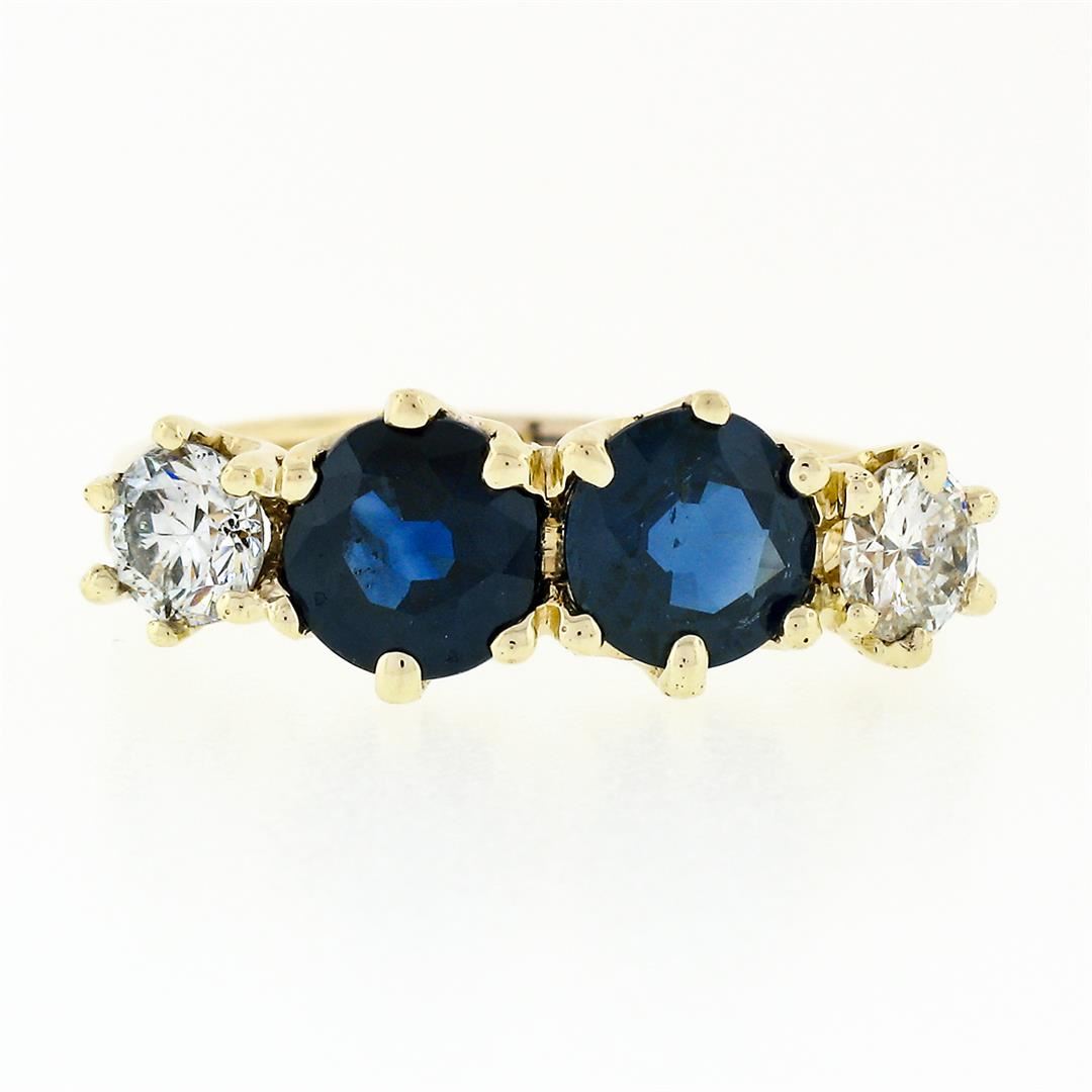 A vintage 14k yellow gold band ring, with 2 round cut natural sapphire (1.70ctw), and 2 round brilliant cut natural diamonds (G/H - SI1/SI2; 0.46ctw). The ring is size 5.0, weighs a total of 2.45 grams, and measures 6.43mm wide.