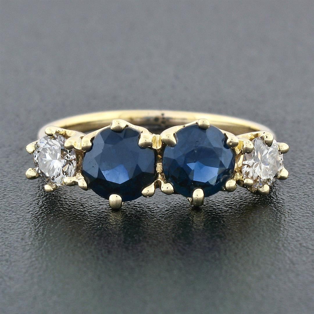 A vintage 14k yellow gold band ring, with 2 round cut natural sapphire (1.70ctw), and 2 round brilliant cut natural diamonds (G/H - SI1/SI2; 0.46ctw). The ring is size 5.0, weighs a total of 2.45 grams, and measures 6.43mm wide.
