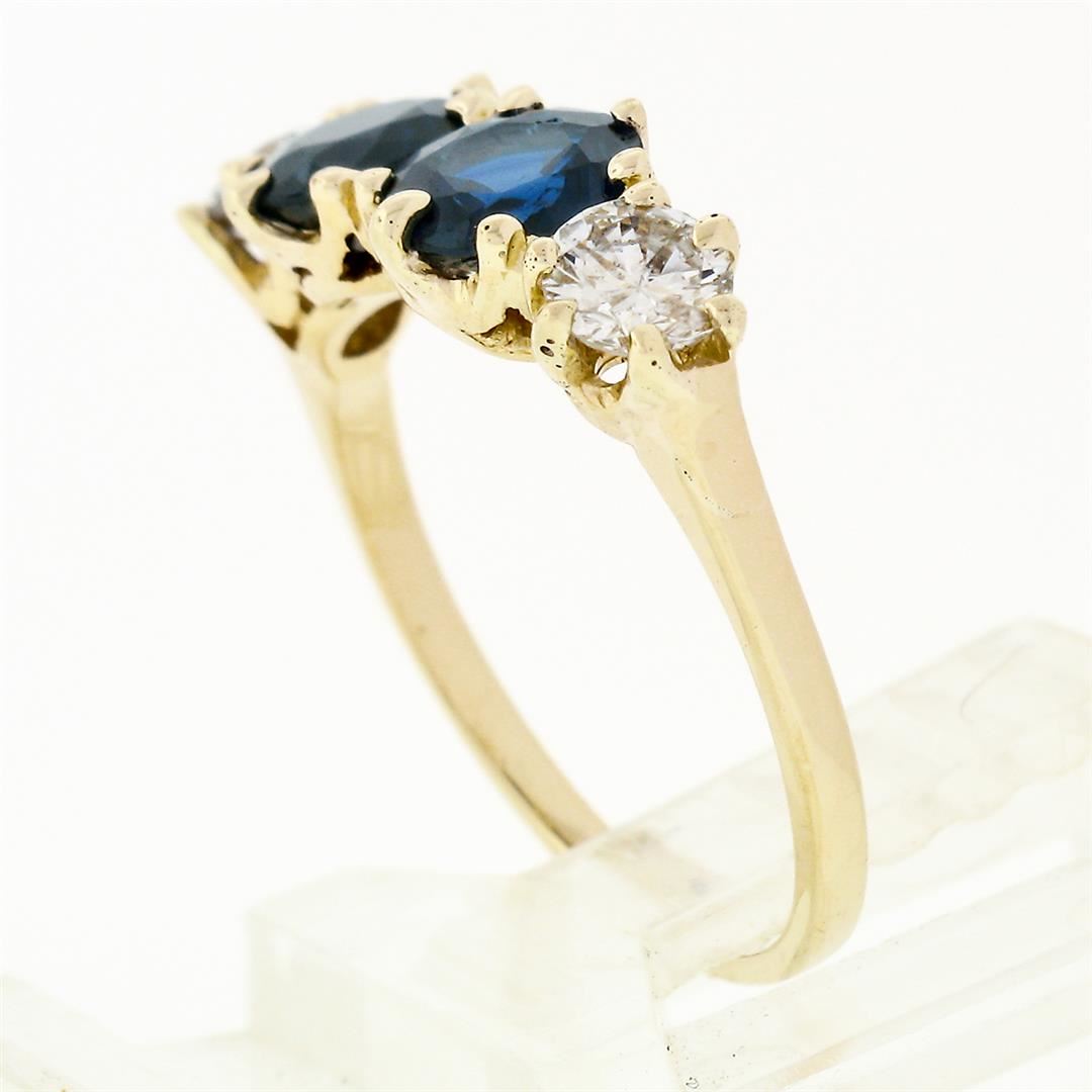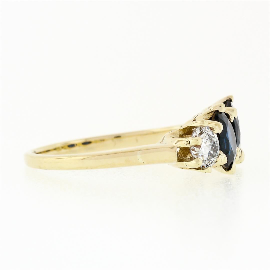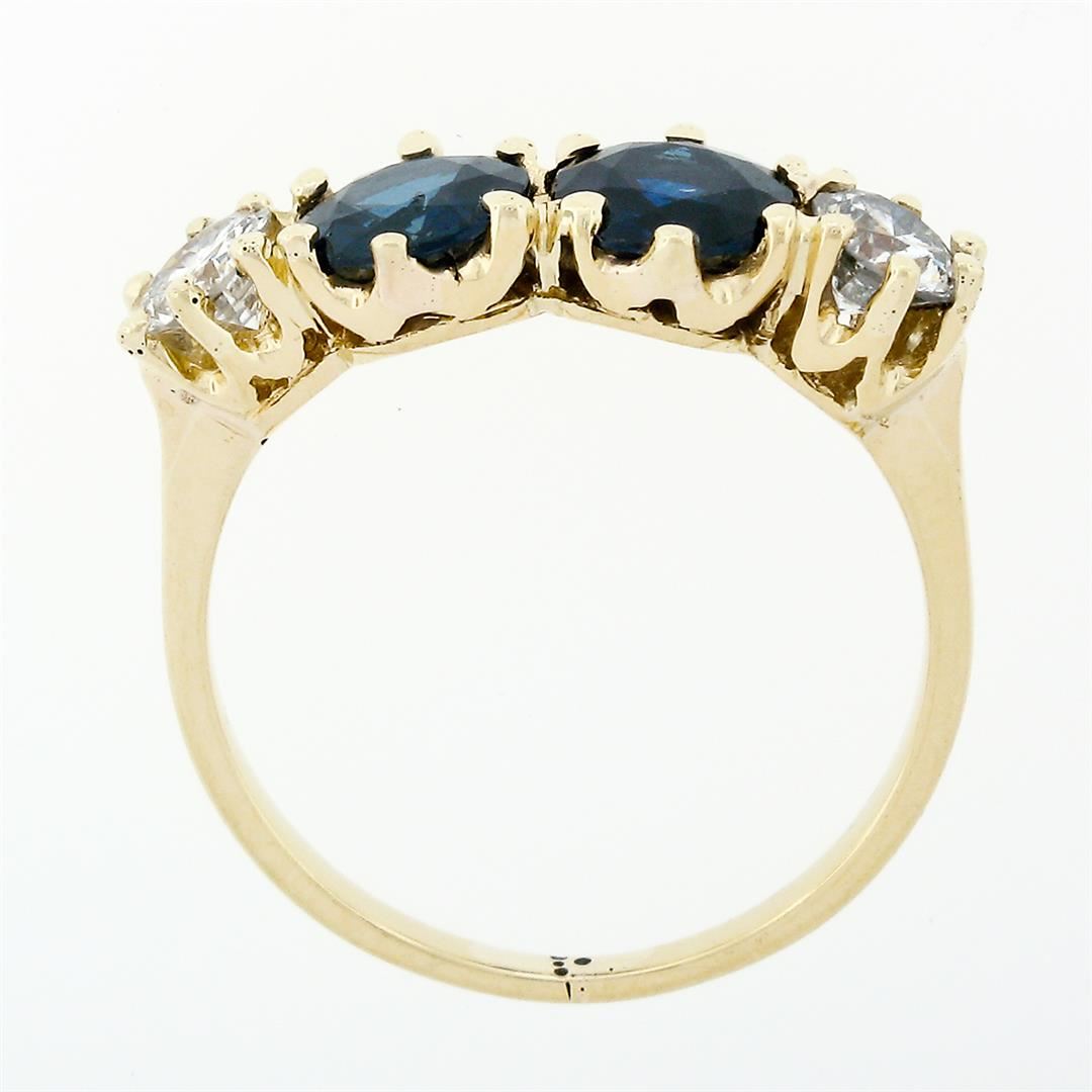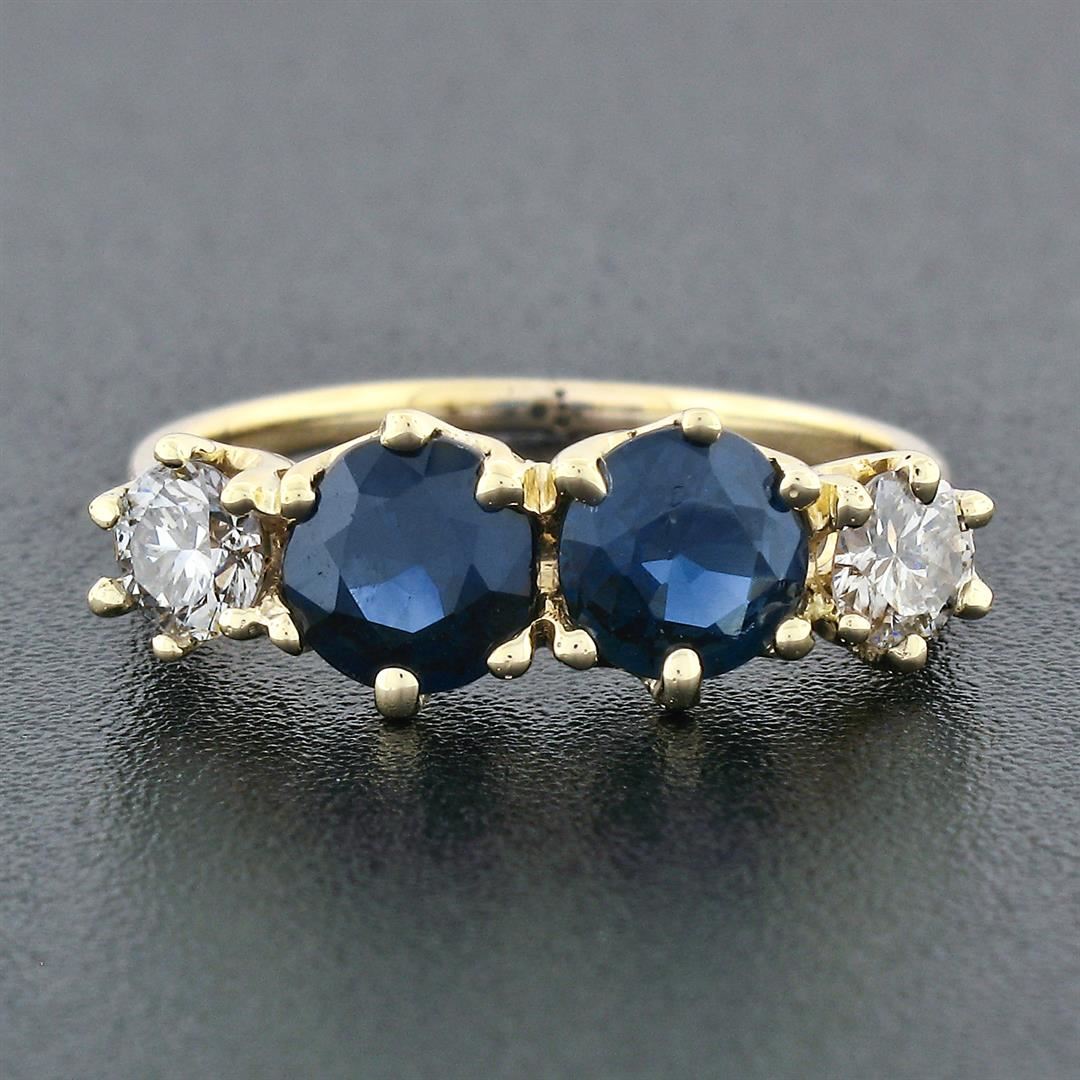 A vintage 14k yellow gold band ring, with 2 round cut natural sapphire (1.70ctw), and 2 round brilliant cut natural diamonds (G/H - SI1/SI2; 0.46ctw). The ring is size 5.0, weighs a total of 2.45 grams, and measures 6.43mm wide.