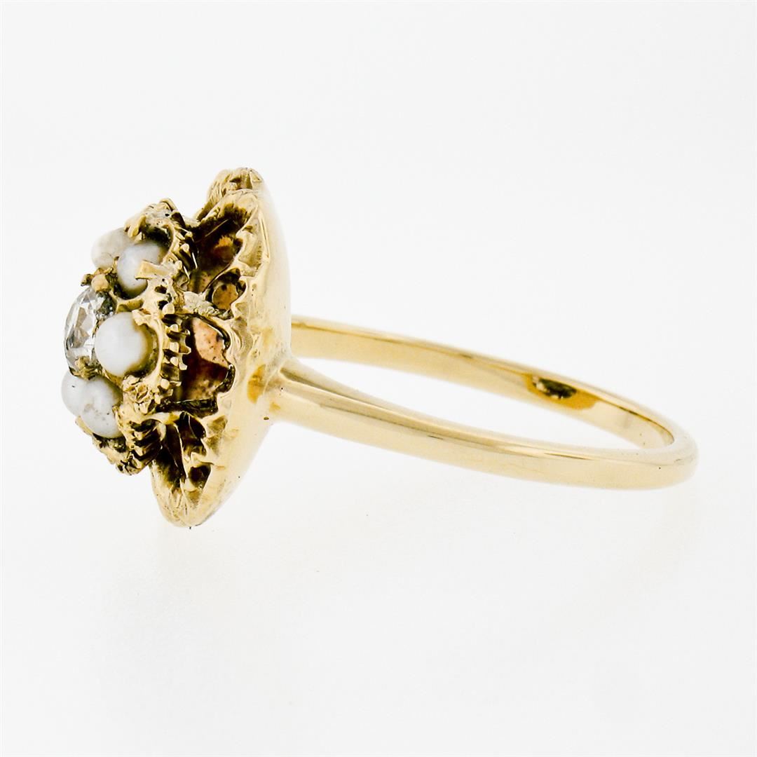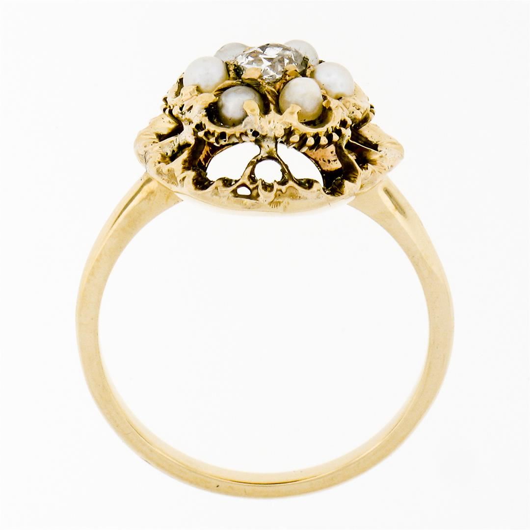 A vintage solid 14k yellow gold tiered ring, with 1 old european cut natural diamond (F - I1 ; 0.21ct), surrounded with 6 round shape natural seed pearls ( 2.6mm). The ring is size 8.0, weighs a total of 4.29 grams, and measures 15.0mm wide.