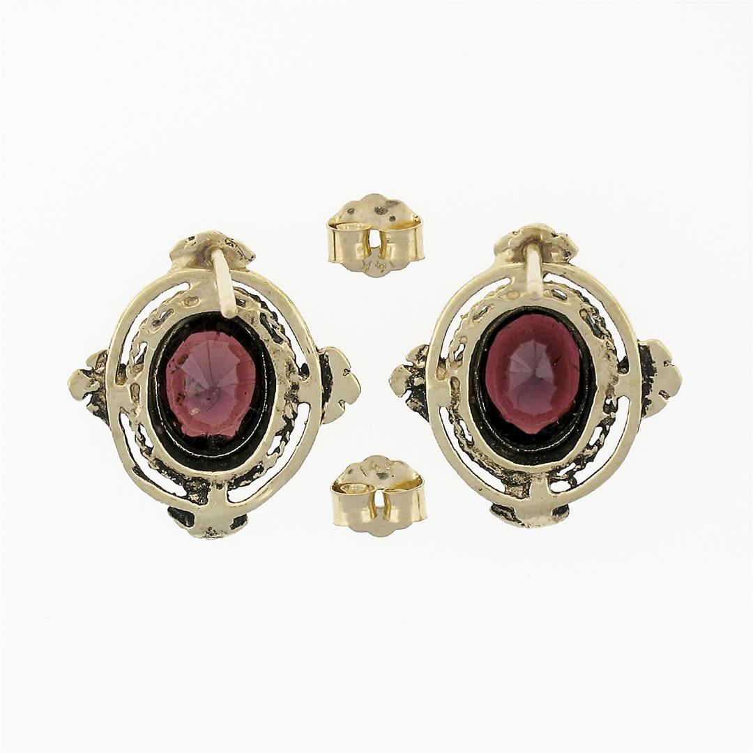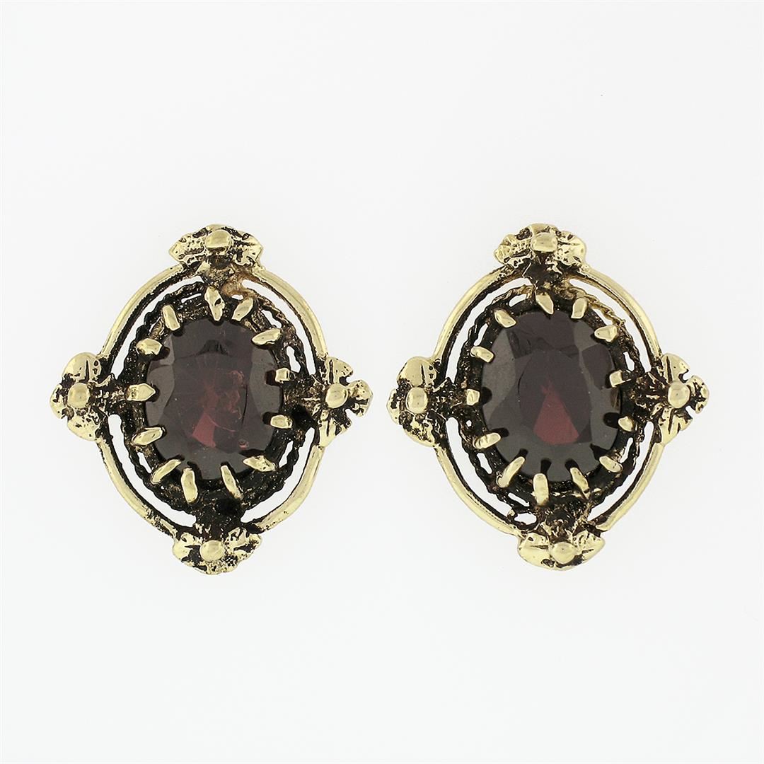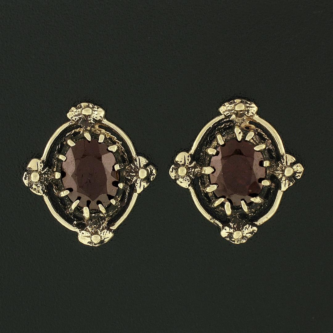 A vintage solid 14k yellow gold stud earrings, with oval cut natural garnets (8.0x6.4mm- 3.20ctw). The earrings measure approximately 16.66x15.47mm and weigh a total of 3.51 grams.