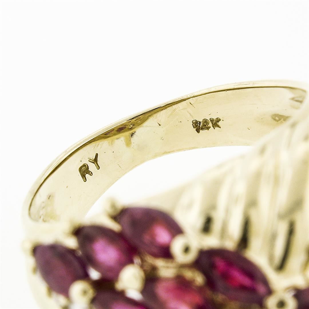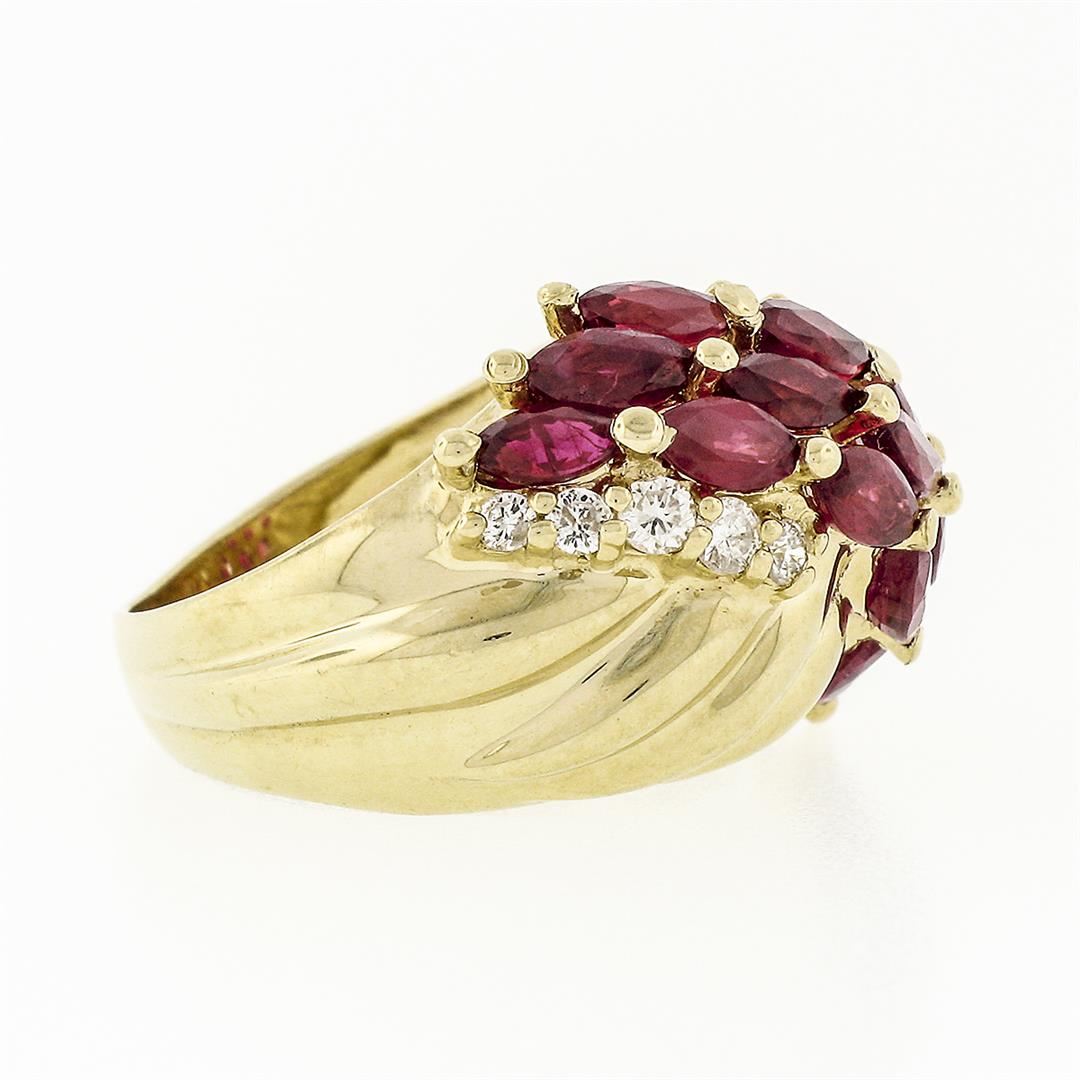 A vintage solid 14k yellow gold ring, with 15 marquise cur natural rubies (3.00ctw ), and 14 round brilliant cut natural diamonds (F/G - VS2/SI1 ; 0.32ctw). The ring is size 4.5, weighs a total of 5.53 grams, and measures 14.80mm wide.