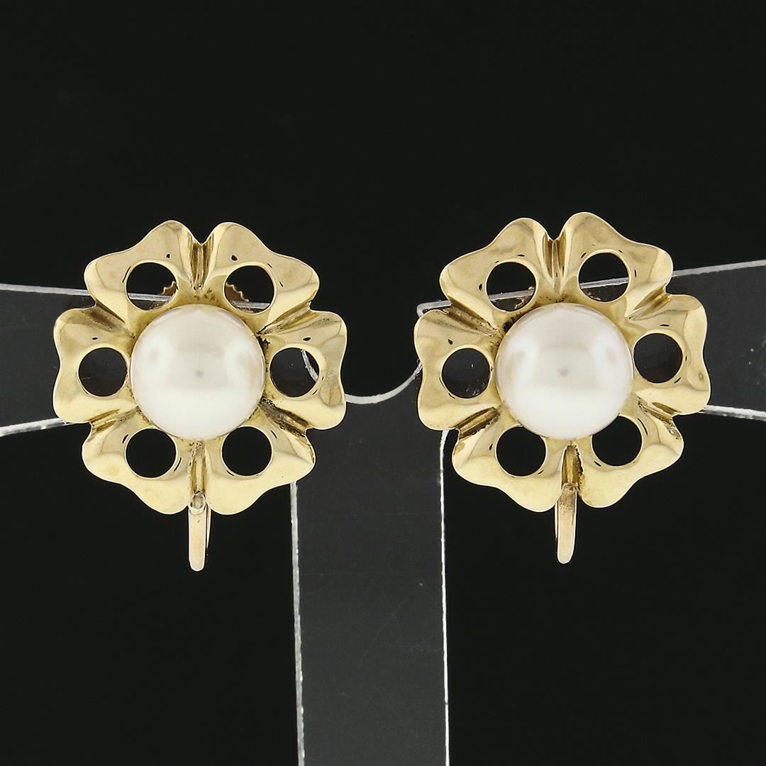 A vintage solid 14k yellow gold earrings, with 2 round shape natural cultured pearls (6.8mm). The earrings measure approximately 14.70mm in diameter and weigh a total of 3.66 grams.