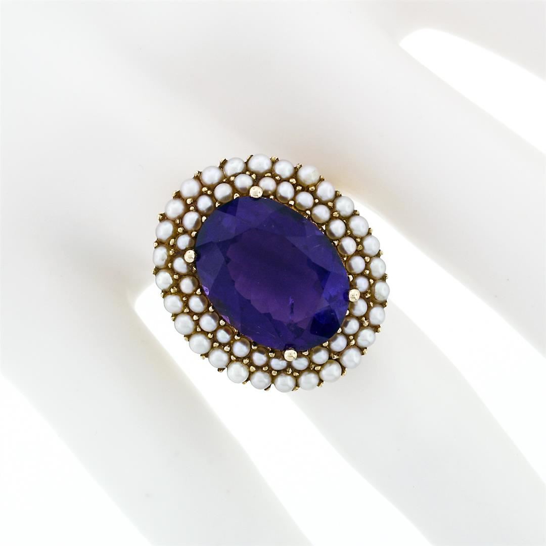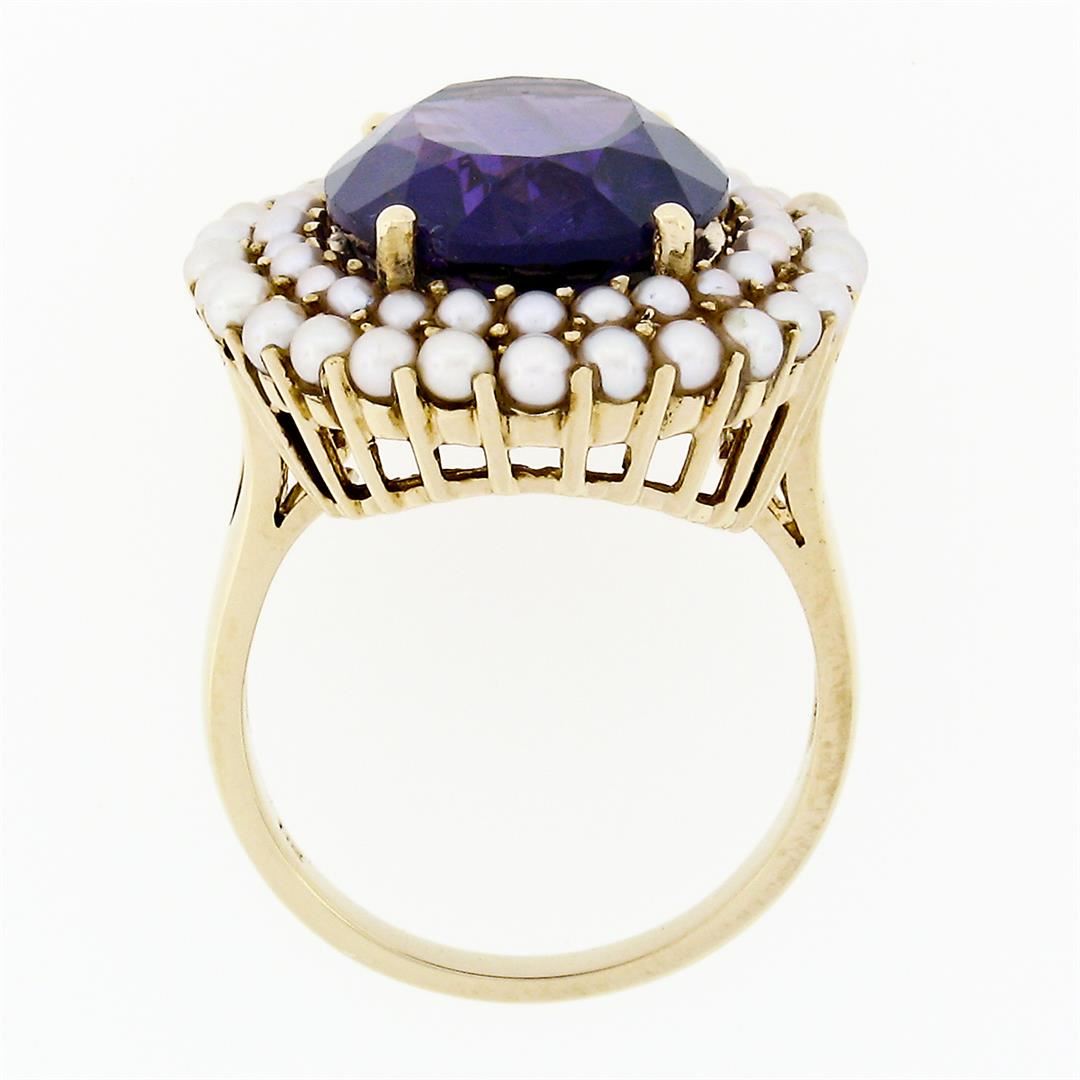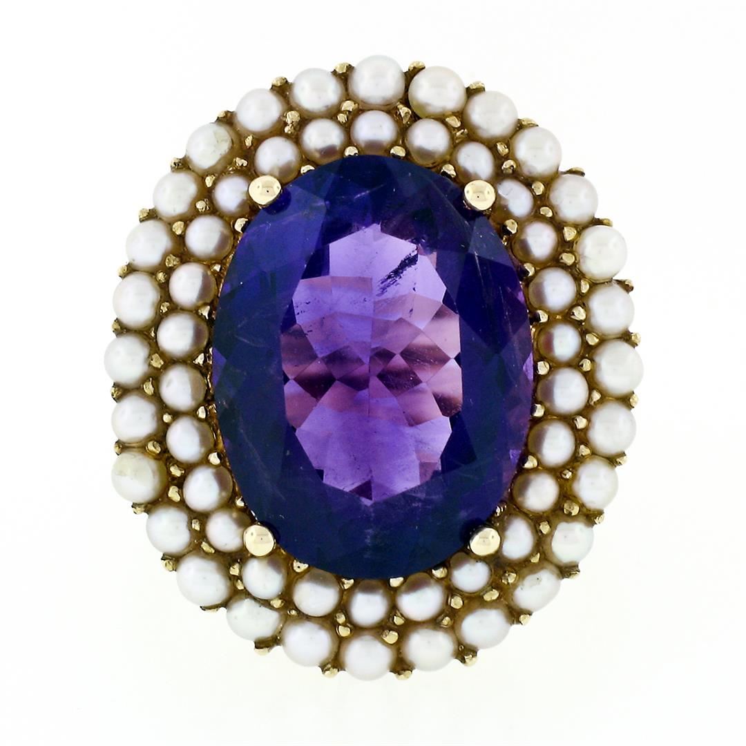 A vintage solid 14k yellow gold ring, with 1 oval cut natural amethyst (15.95x12.05mm - 7.13ct), surrounded with a halo of round shape natural seed pearls (1.75 and 2.25mm). The ring is size 7.0, weighs a total of 9.84 grams, and measures 23.81mm wide.