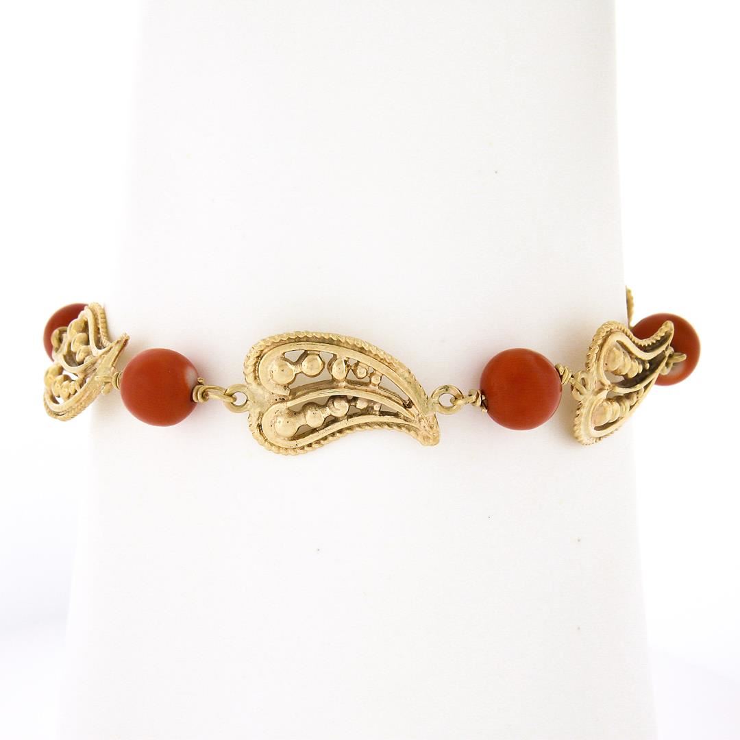 A vintage solid 14k yellow gold bracelet, with 5 round bead shape natural corals (7.4 to 7.6mm). It weighs a total of 12.94 grams, measures 12.1mm wide, and measures 6.5 inches in length.