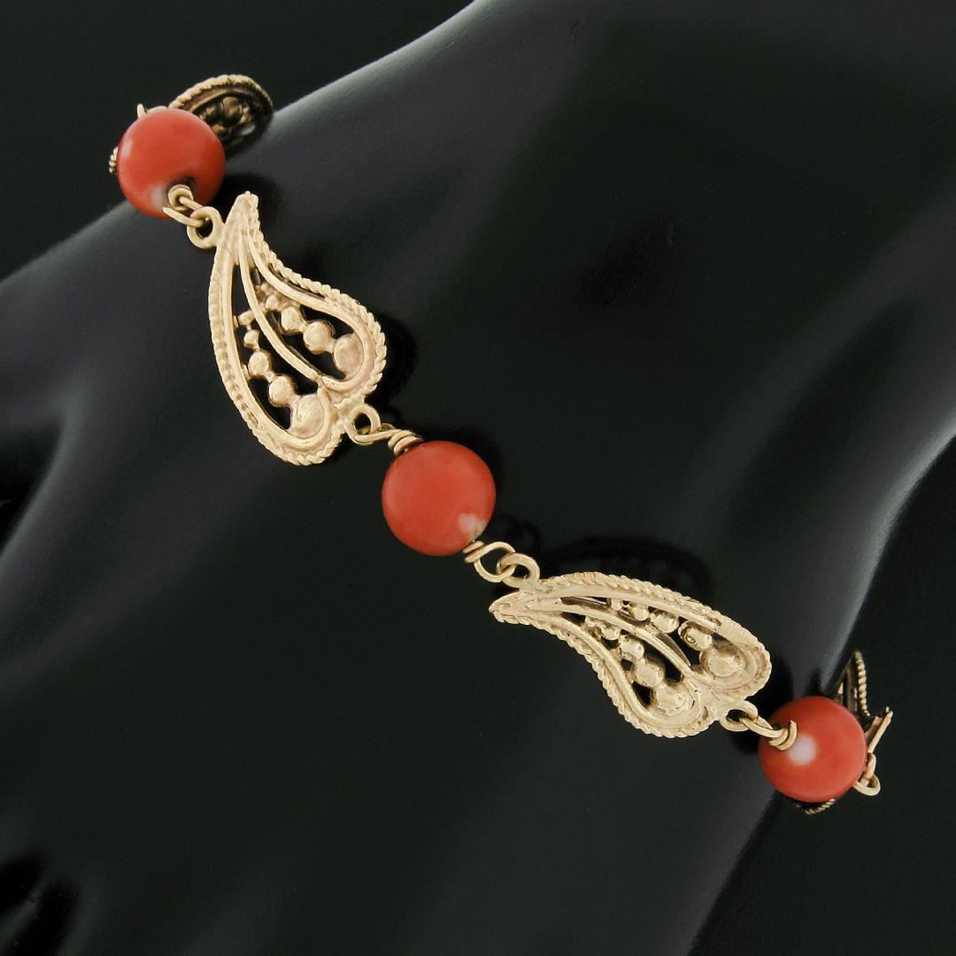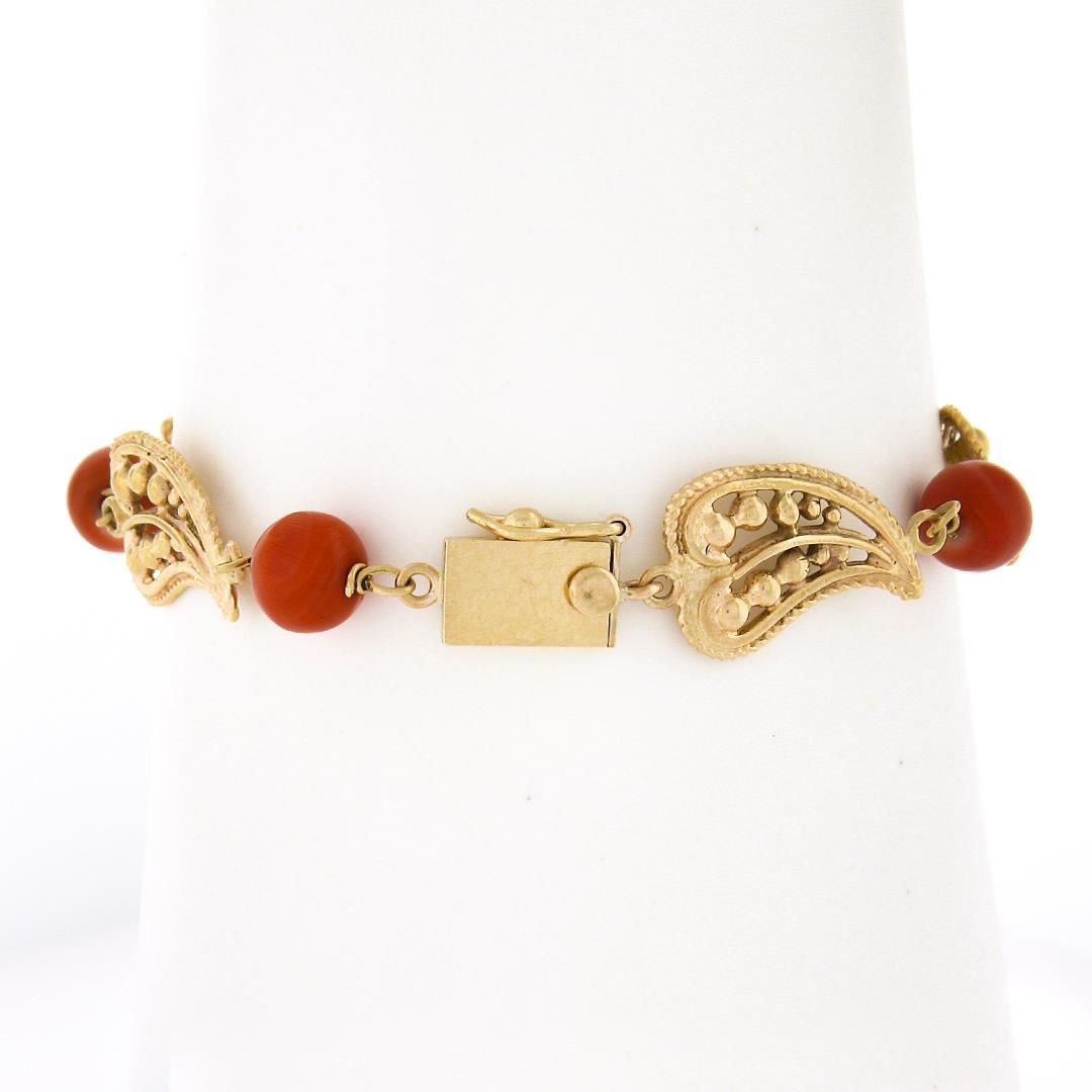 A vintage solid 14k yellow gold bracelet, with 5 round bead shape natural corals (7.4 to 7.6mm). It weighs a total of 12.94 grams, measures 12.1mm wide, and measures 6.5 inches in length.