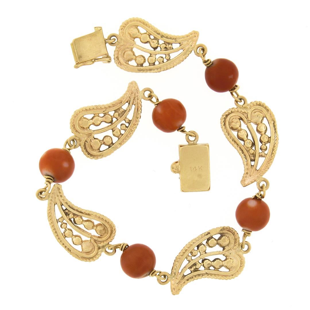 A vintage solid 14k yellow gold bracelet, with 5 round bead shape natural corals (7.4 to 7.6mm). It weighs a total of 12.94 grams, measures 12.1mm wide, and measures 6.5 inches in length.