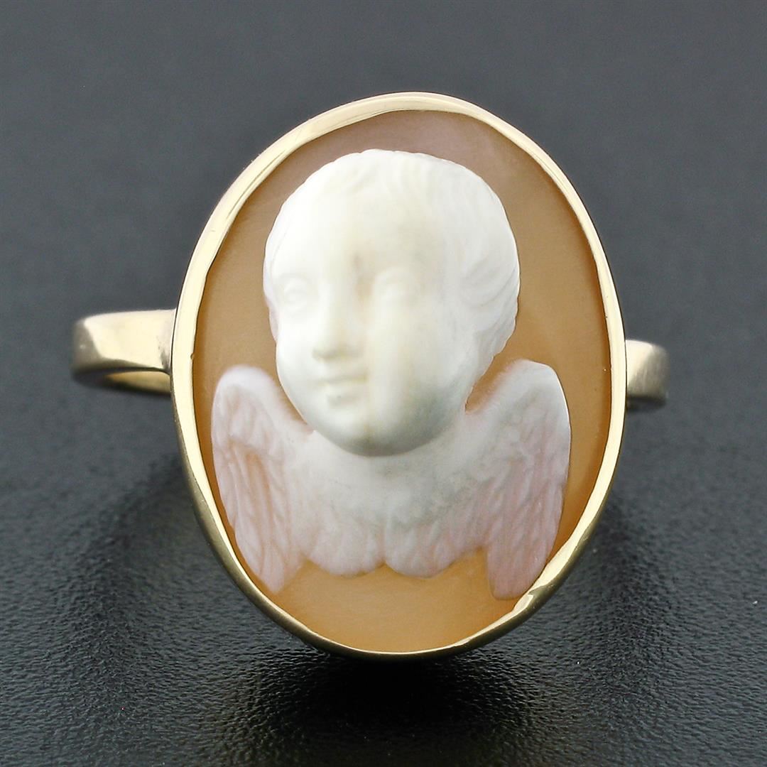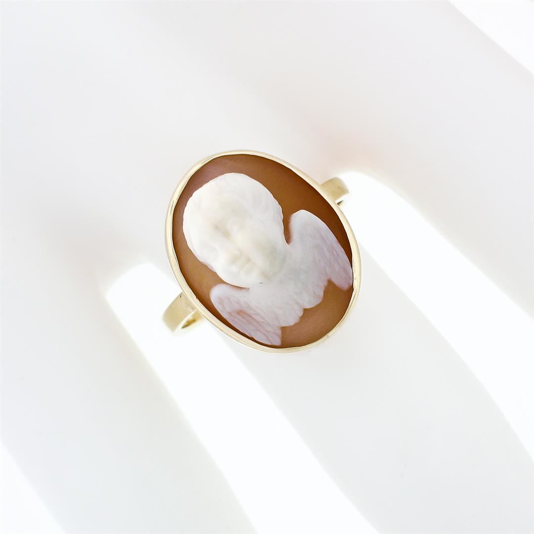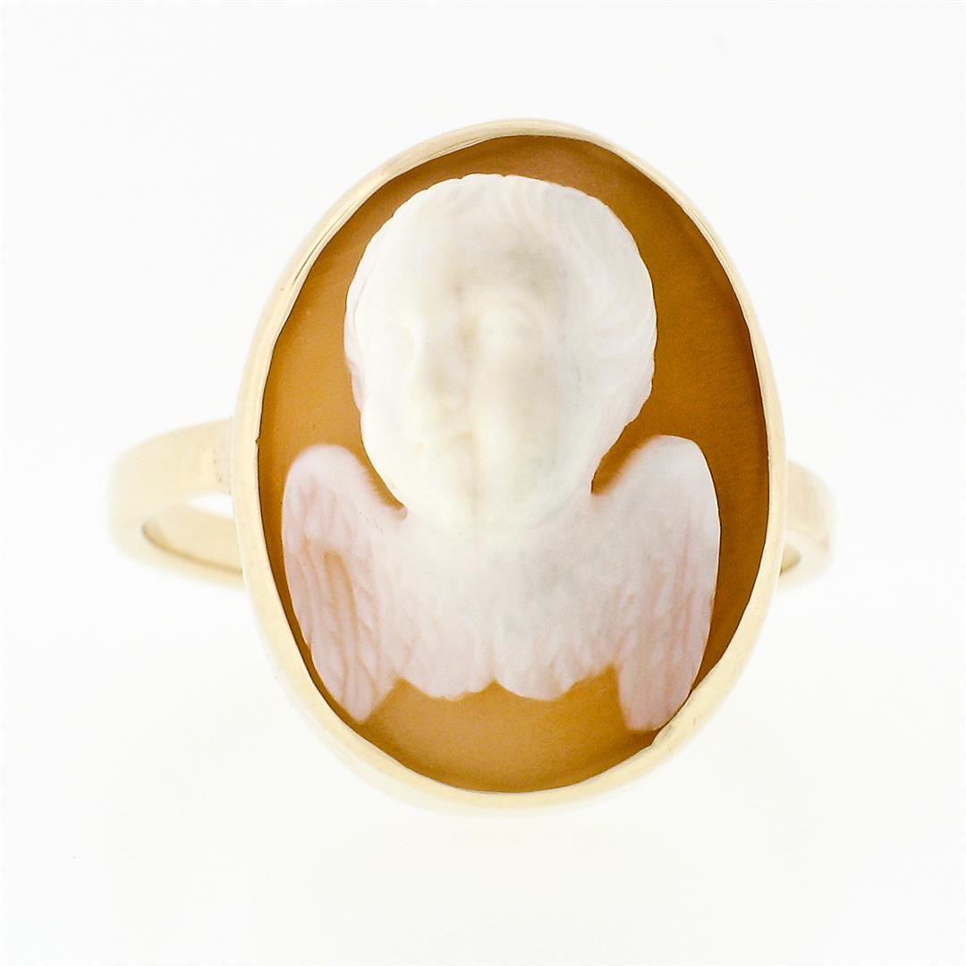 A vintage solid 14k yellow gold ring set with an oval cut natural shell (16.0x12.0mm) with a high-relief carving of an angel. The ring is size 6.5, weighs a total of 4.20 grams, and measures 17.15mm wide.