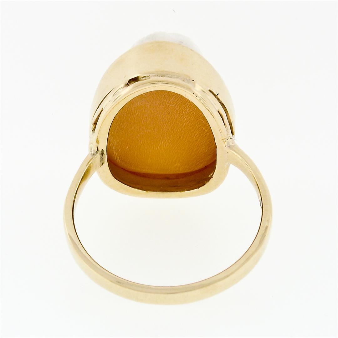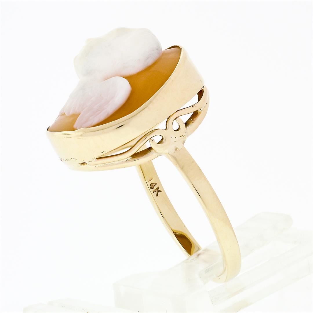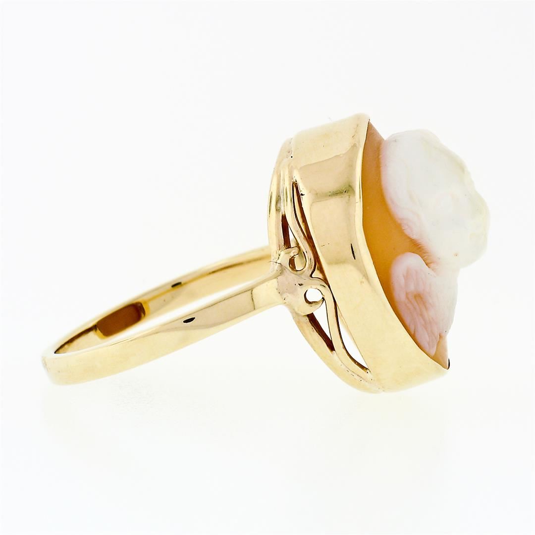 A vintage solid 14k yellow gold ring set with an oval cut natural shell (16.0x12.0mm) with a high-relief carving of an angel. The ring is size 6.5, weighs a total of 4.20 grams, and measures 17.15mm wide.