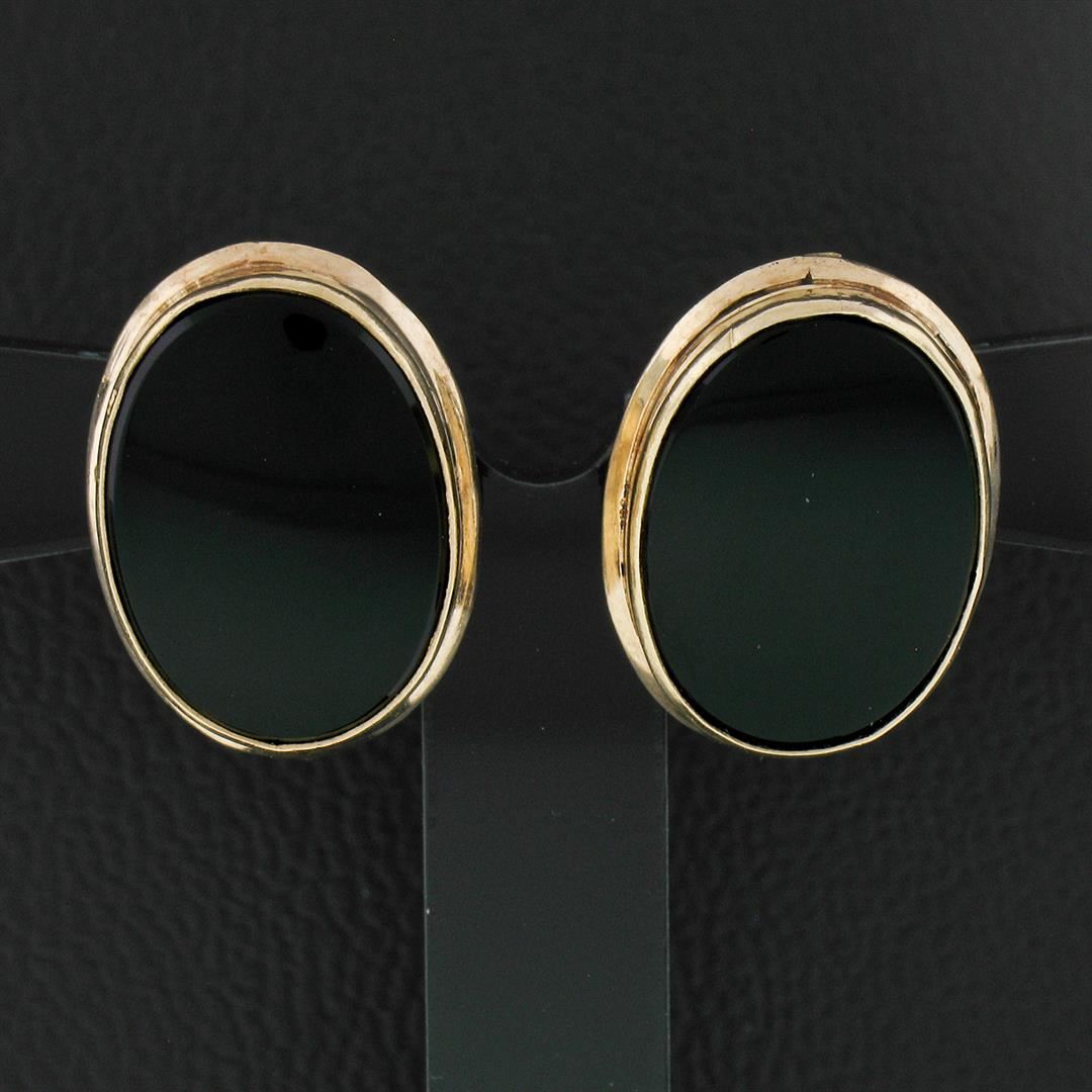 A pair of vintage 14k yellow gold button earrings featuring a pair of oval cabochon black onyx stones (15.85x11.85mm). The earrings measure approximately 19.50x13.85mm and weigh a total of 4.60 grams.
