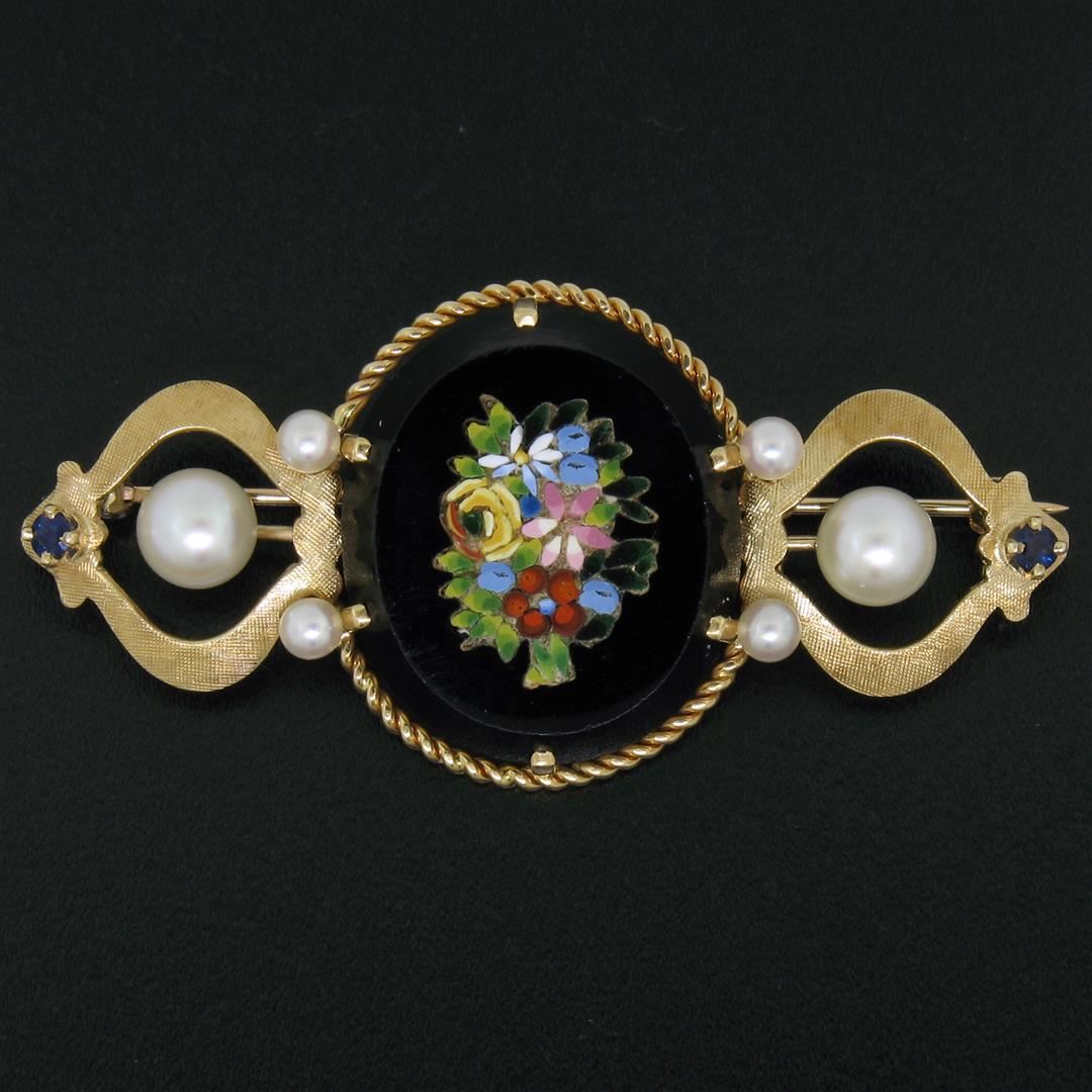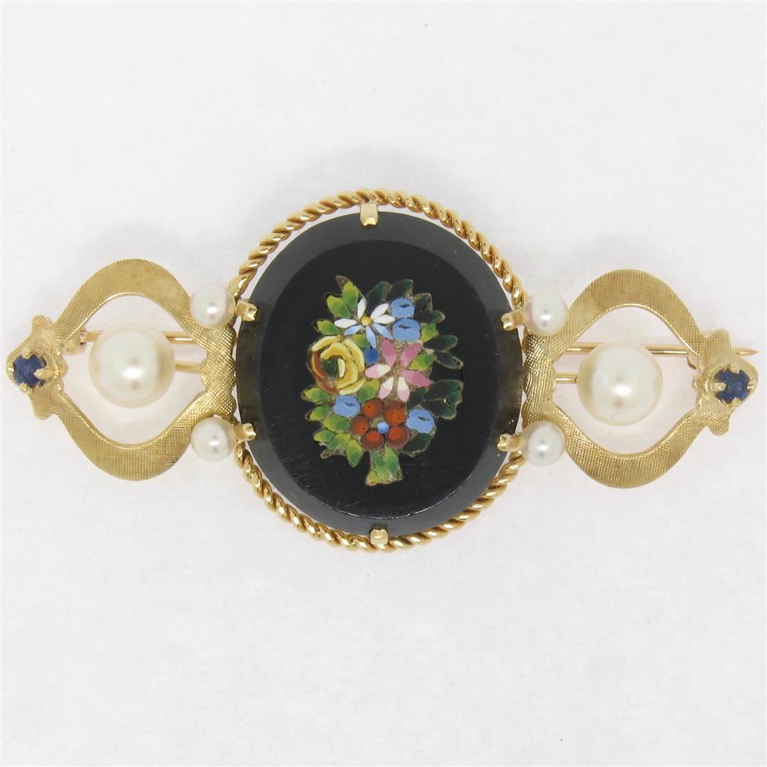 A vintage 14k yellow gold brooch with a 22.75x20.20mm black onyx floral mosaic accented by 0.18ctw of round sapphires and both 6.15mm and 3.20mm pearls. Measures 53.60x26.05mm and weighs a total of 9.24 grams.