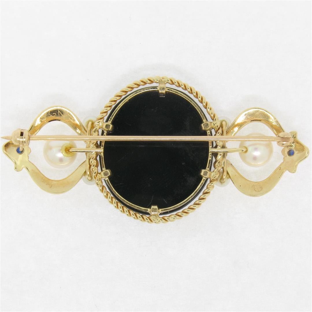 A vintage 14k yellow gold brooch with a 22.75x20.20mm black onyx floral mosaic accented by 0.18ctw of round sapphires and both 6.15mm and 3.20mm pearls. Measures 53.60x26.05mm and weighs a total of 9.24 grams.