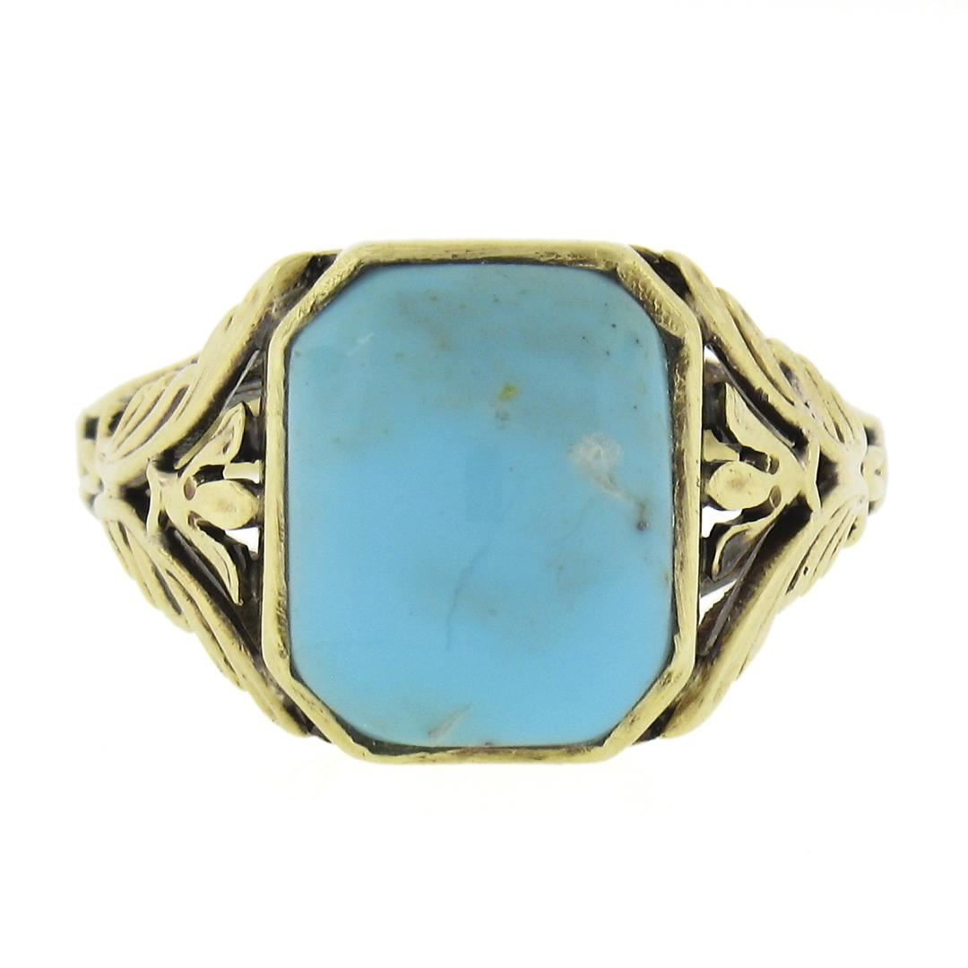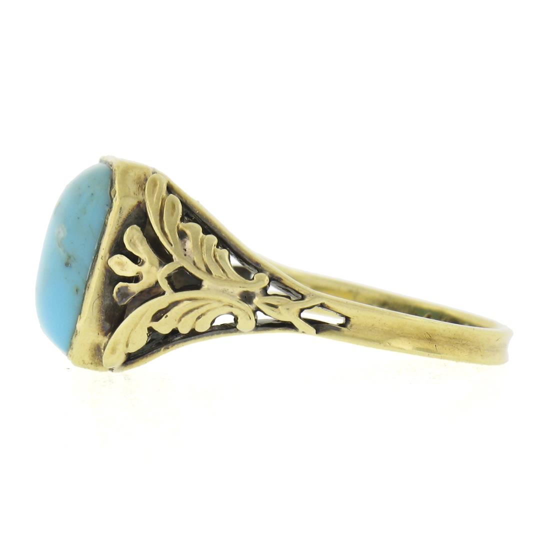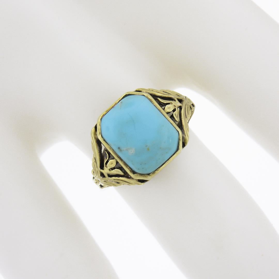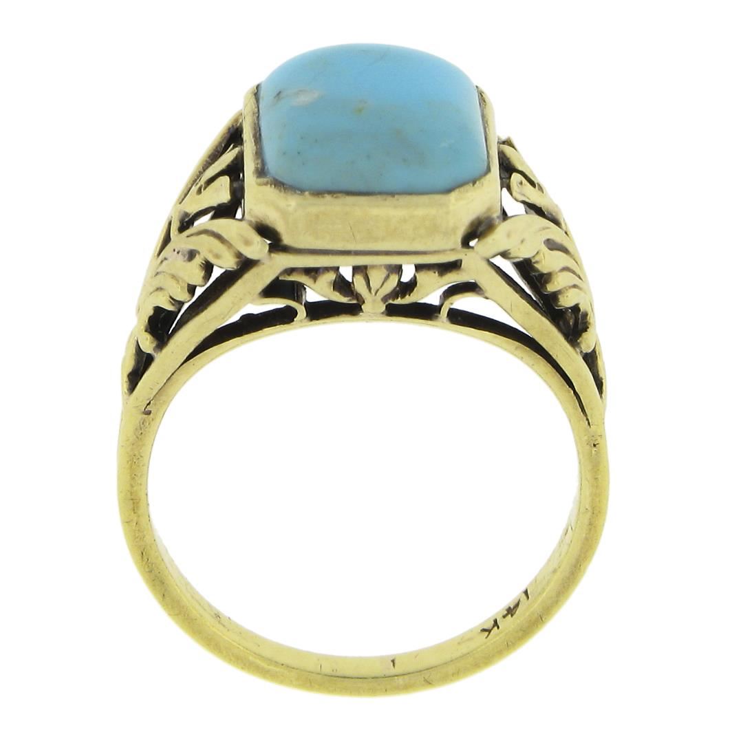 A vintage solid 14k yellow gold ring, with 1 rectangular cabochon cut natural turquoise (10x7.9mm). The ring is size 5.0, weighs a total of 3.39 grams, and measures 11.1mm wide.