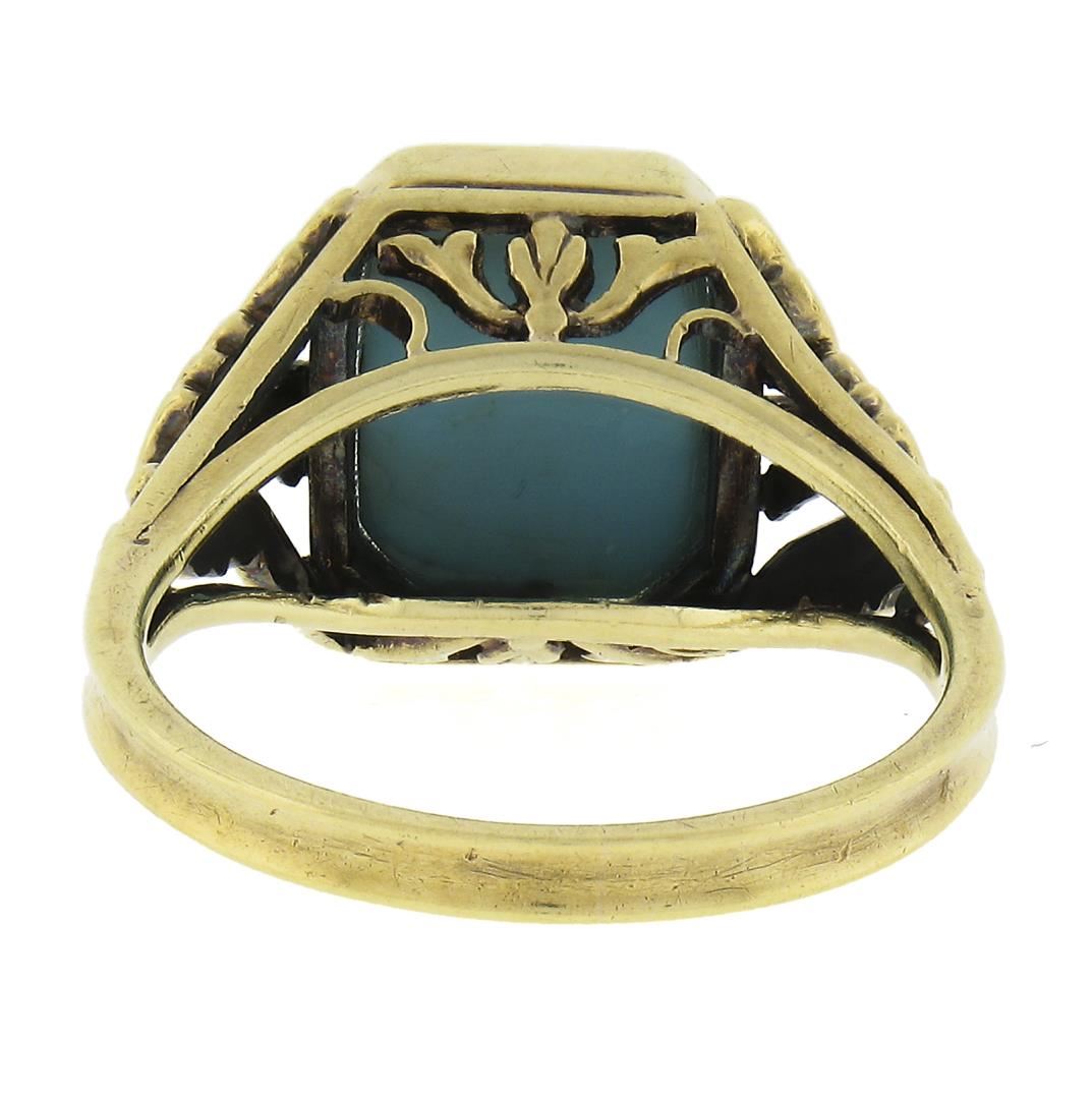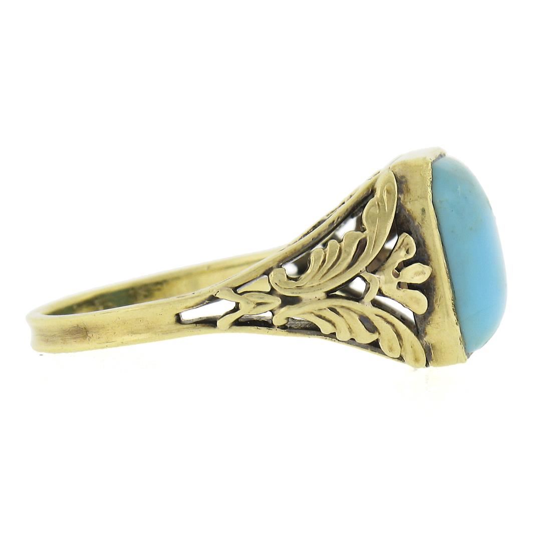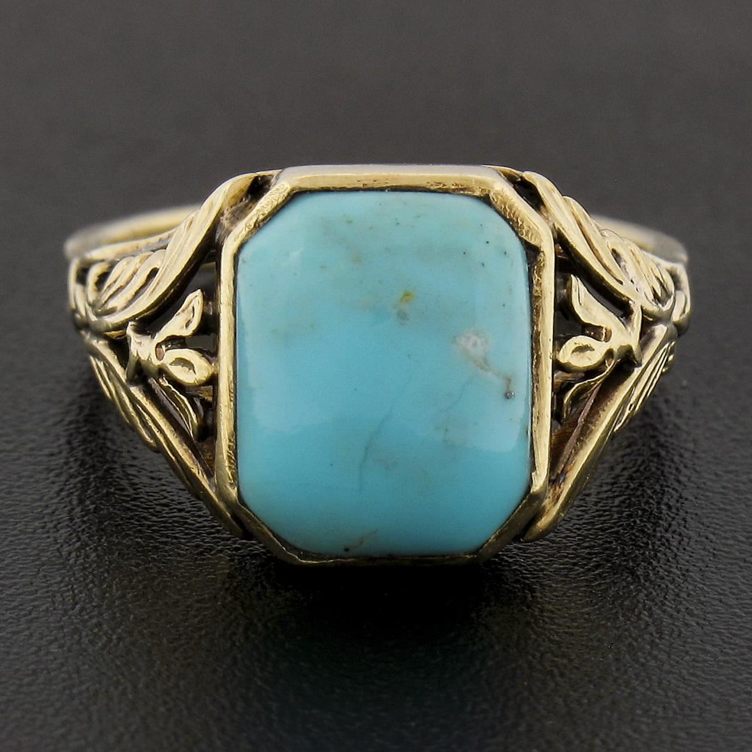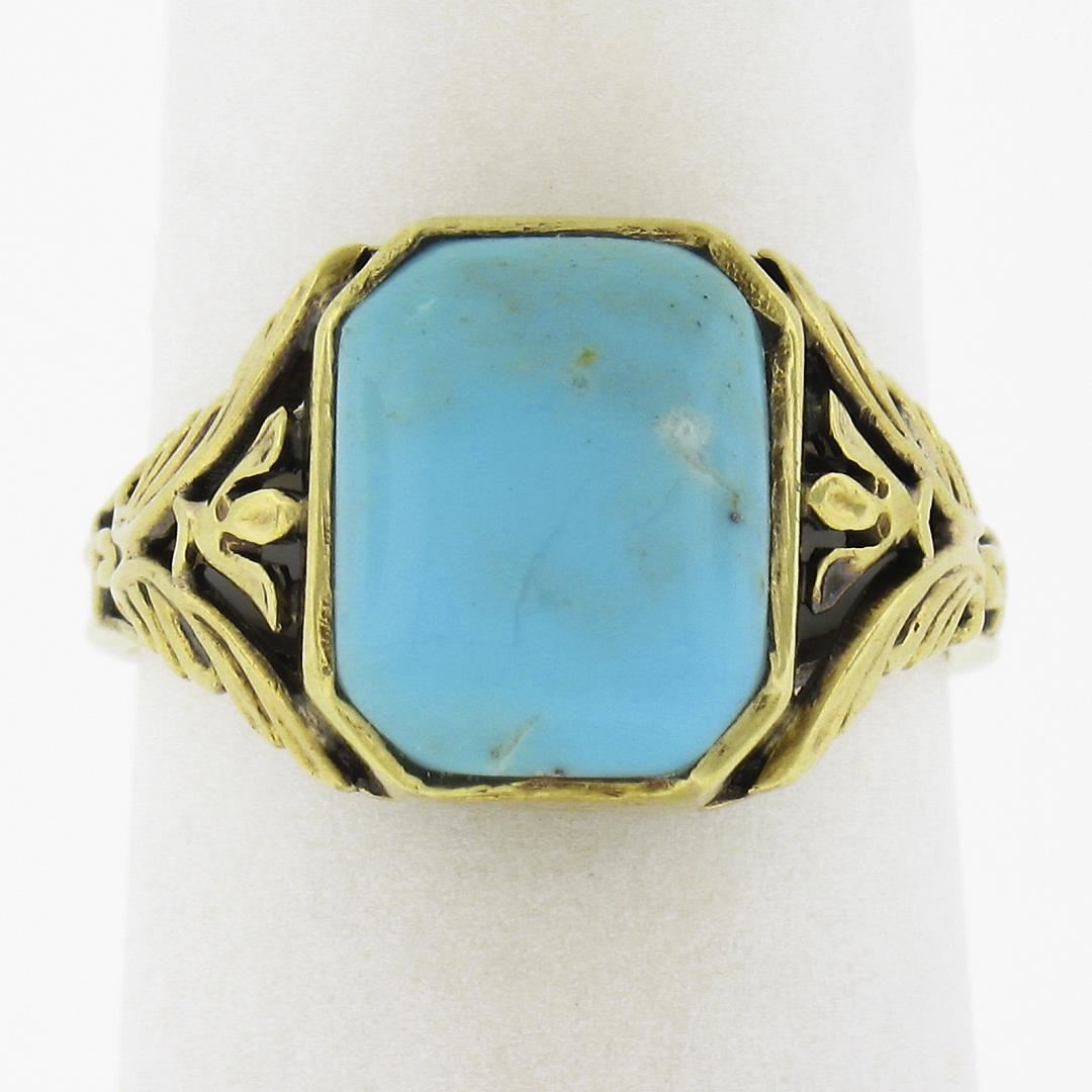 A vintage solid 14k yellow gold ring, with 1 rectangular cabochon cut natural turquoise (10x7.9mm). The ring is size 5.0, weighs a total of 3.39 grams, and measures 11.1mm wide.