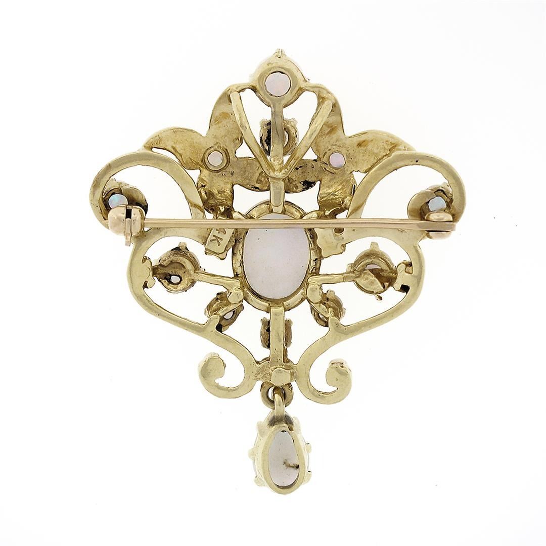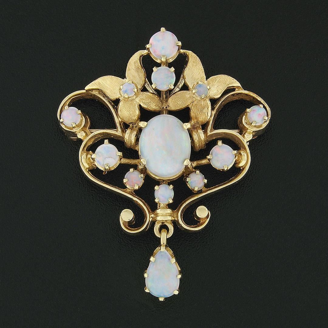 A vintage solid 14k yellow gold pin broch pendant, with 1 oval cabochon cut natural opal (10x8mm), & 1 pear cabochon cut natural opal (8x5.3mm), with 11 round cabochon cut natural opals (4.6mm to 2.3mm). Measures 42.55x#34mm and weighs a total of 10.20 grams.
