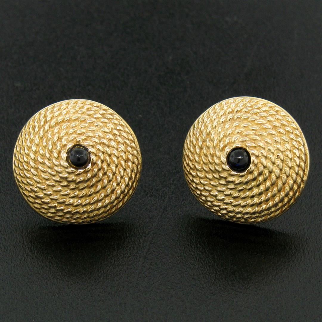 One Pair 14k Yellow Gold Round Cabochon Sapphire Topped Twisted Wire Cone Shaped Earrings. Item Details: Material: 14K Solid Yellow Gold, Weight: 7.6 Grams, Stone(s): (2) Natural Genuine Sapphires - Round Cabochon Cut - Bezel Set - Deep Blue Color, Total Carat Weight: 0.30 (approx.), Backing: Post Backs w/ Butterfly Fastenings (Pierced ears required), Diameter: 14.85mm, Thickness: 7.3mm projection off the ear, Signature: 14K SI 585 MMA ©1995 Condition: Amazing Like New Condition!