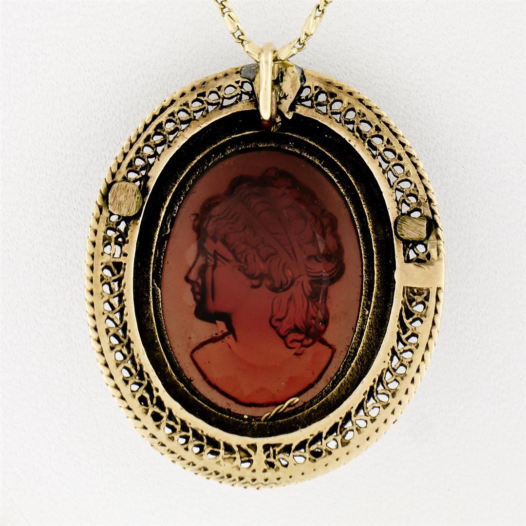 A vintage solid 14k yellow gold pendant necklace, with 1 oval shaped carved glass cameo (21.2x15.8mm), and 55 natural see pearls (1.5mm).The pendant weighs a total of 12.27 grams, measures 31.4x26mm including the bail, and 18 inch fancy link chain.
