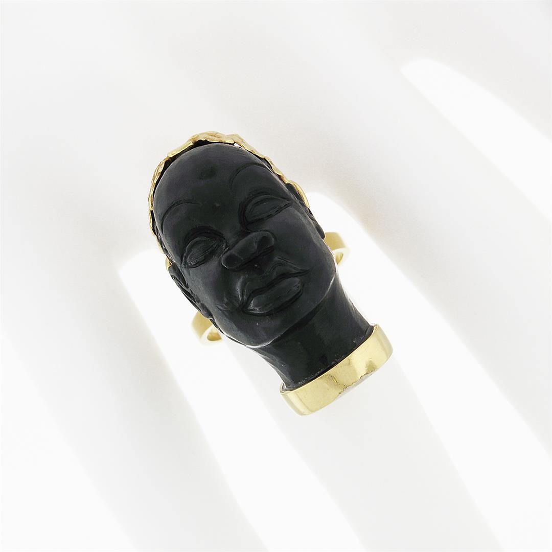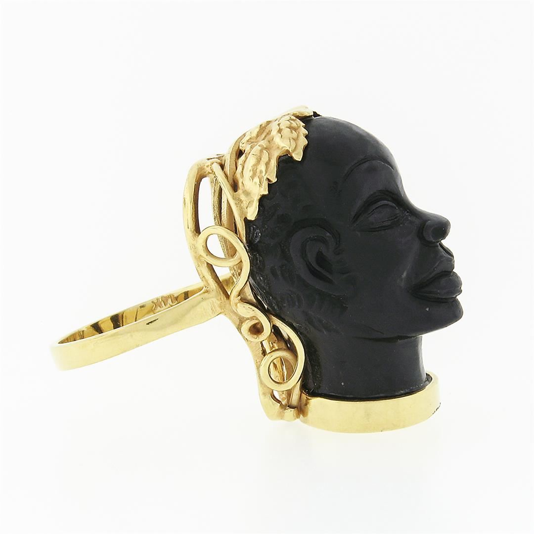 A vintage solid 14k yelow gold ring, with 1 carved natural blackmoor (24.3x15.1mm ). The ring is size 6.5, weighs a total of 16.91 grams, and measures 28.5mm wide.