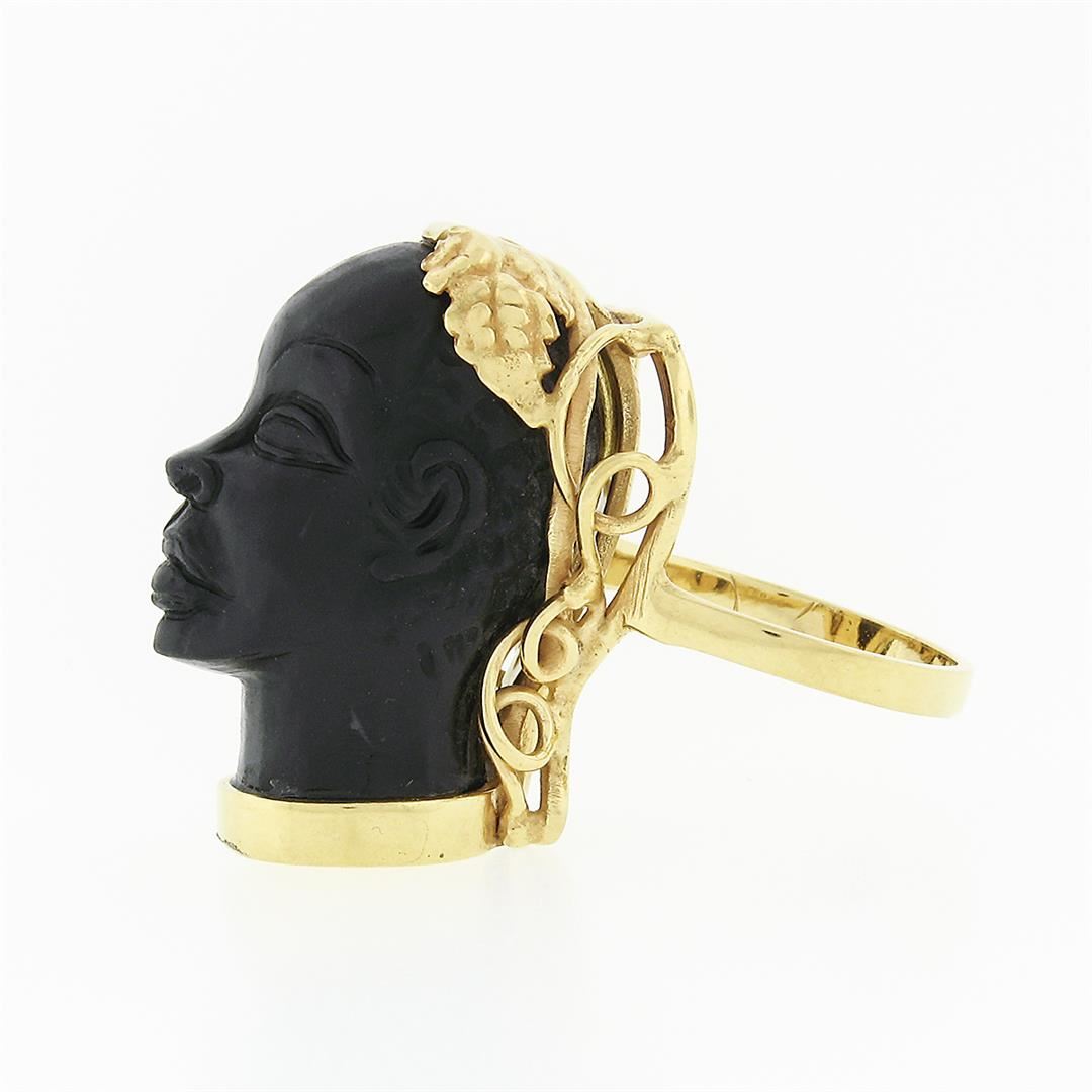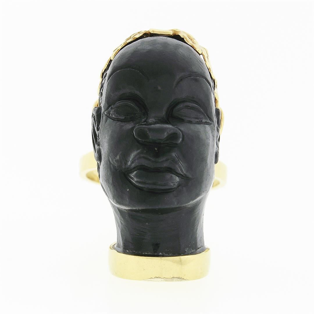 A vintage solid 14k yelow gold ring, with 1 carved natural blackmoor (24.3x15.1mm ). The ring is size 6.5, weighs a total of 16.91 grams, and measures 28.5mm wide.