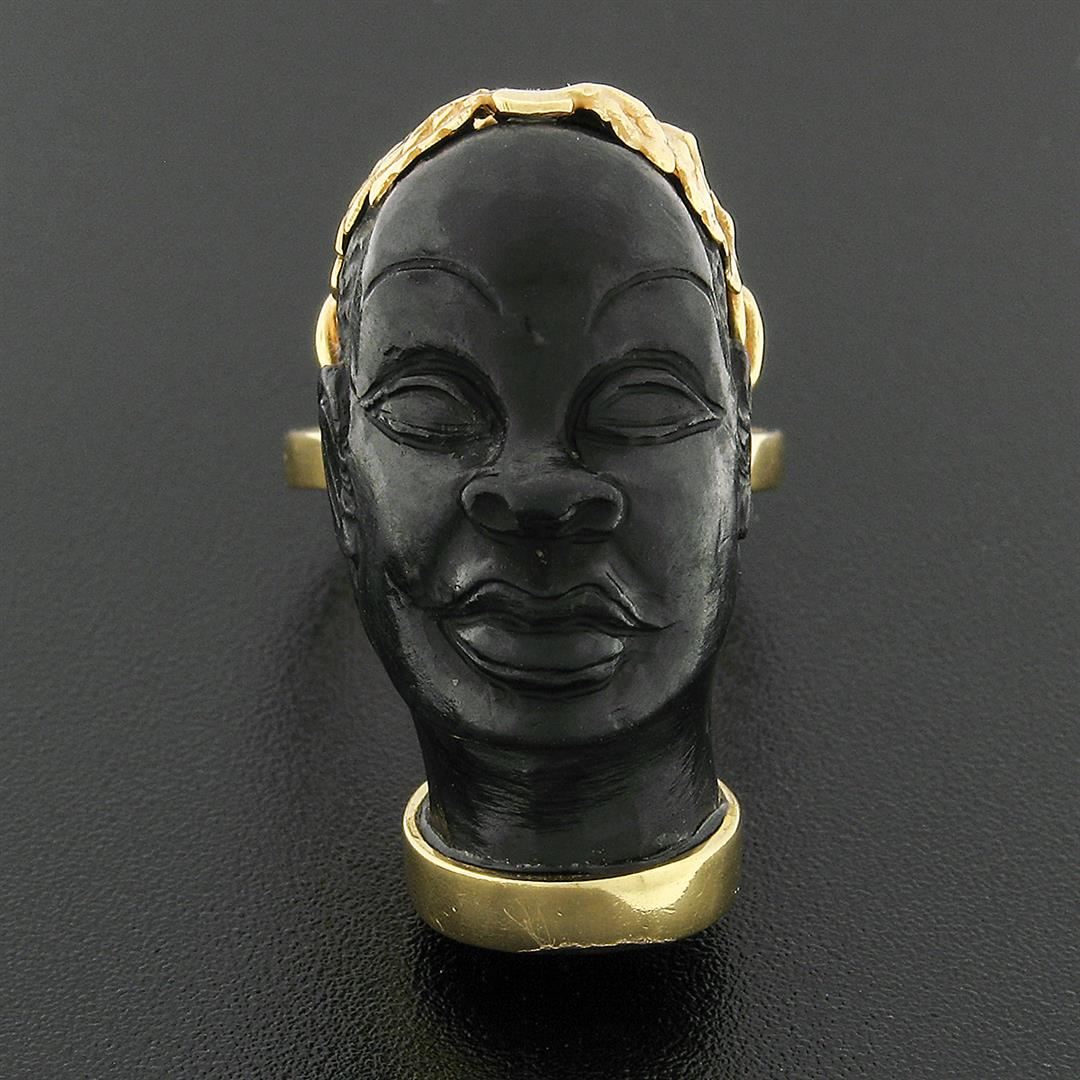 A vintage solid 14k yelow gold ring, with 1 carved natural blackmoor (24.3x15.1mm ). The ring is size 6.5, weighs a total of 16.91 grams, and measures 28.5mm wide.