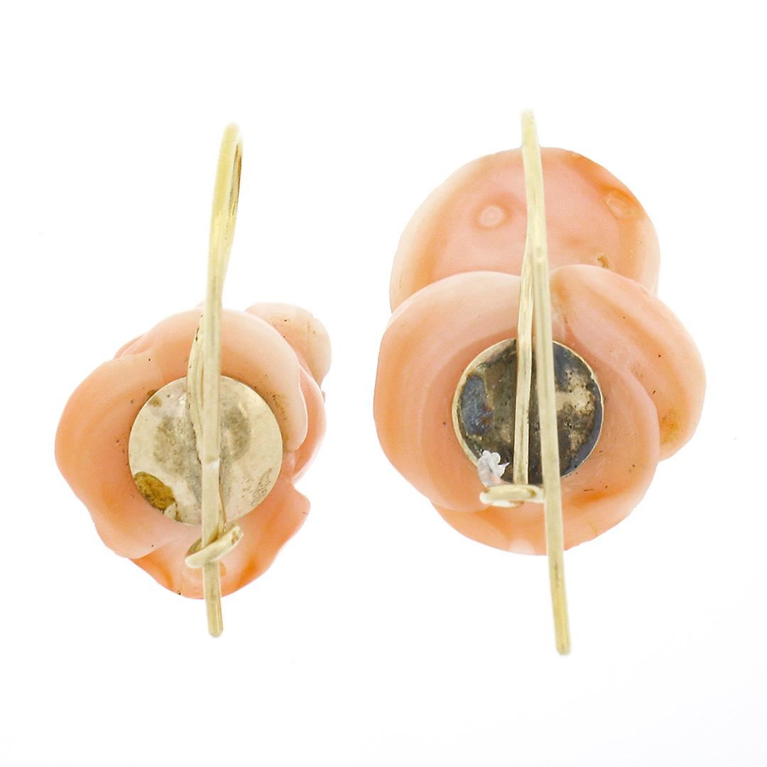A solid 14k yellow gold drop earrings, with 2 carved rose flower shape natural corals(14.25x12.10mm & 19.60x15.55mm). The earrings measure approximately 23.20x12.10mm and weigh a total of 6.80 grams.