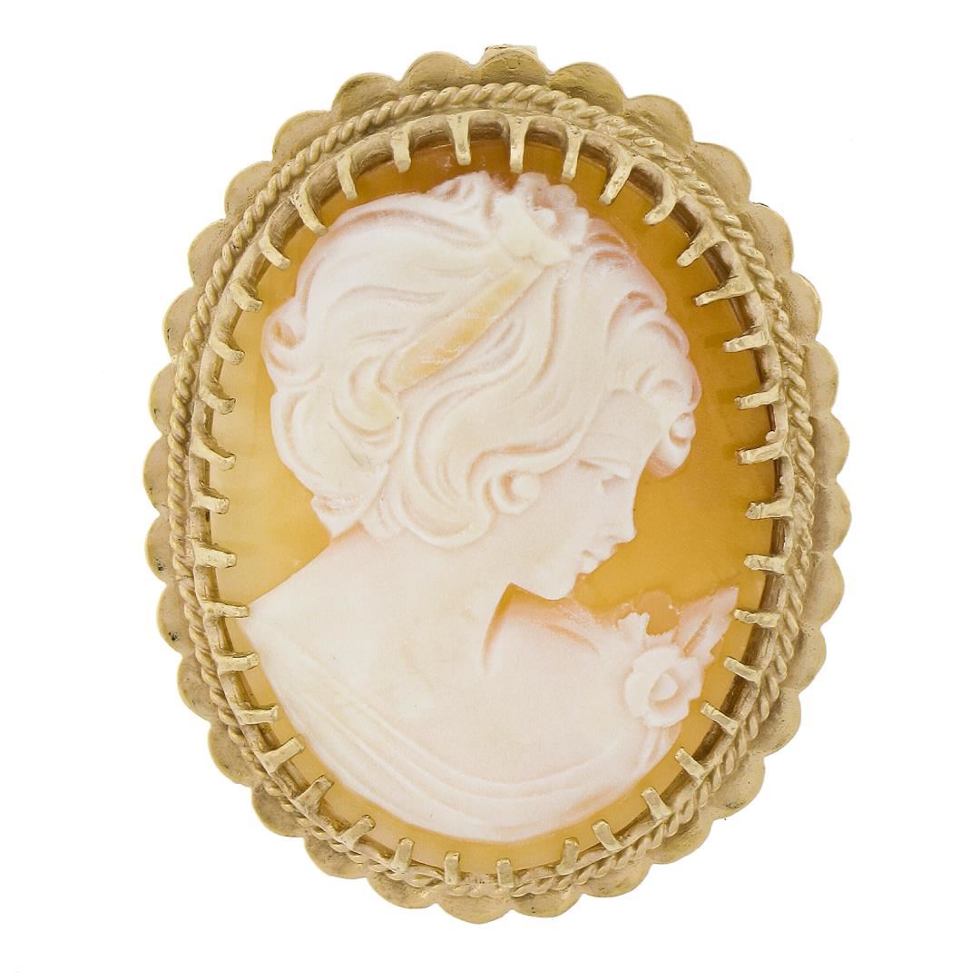 A vintage solid 14k yellow gold brooch pendant, with 1 oval carved cameo shell (35.3x26.5mm ). Measures 42.9x34.2mm and inside bail dimensions 4.3x2mm, it weighs a total of 13 grams.