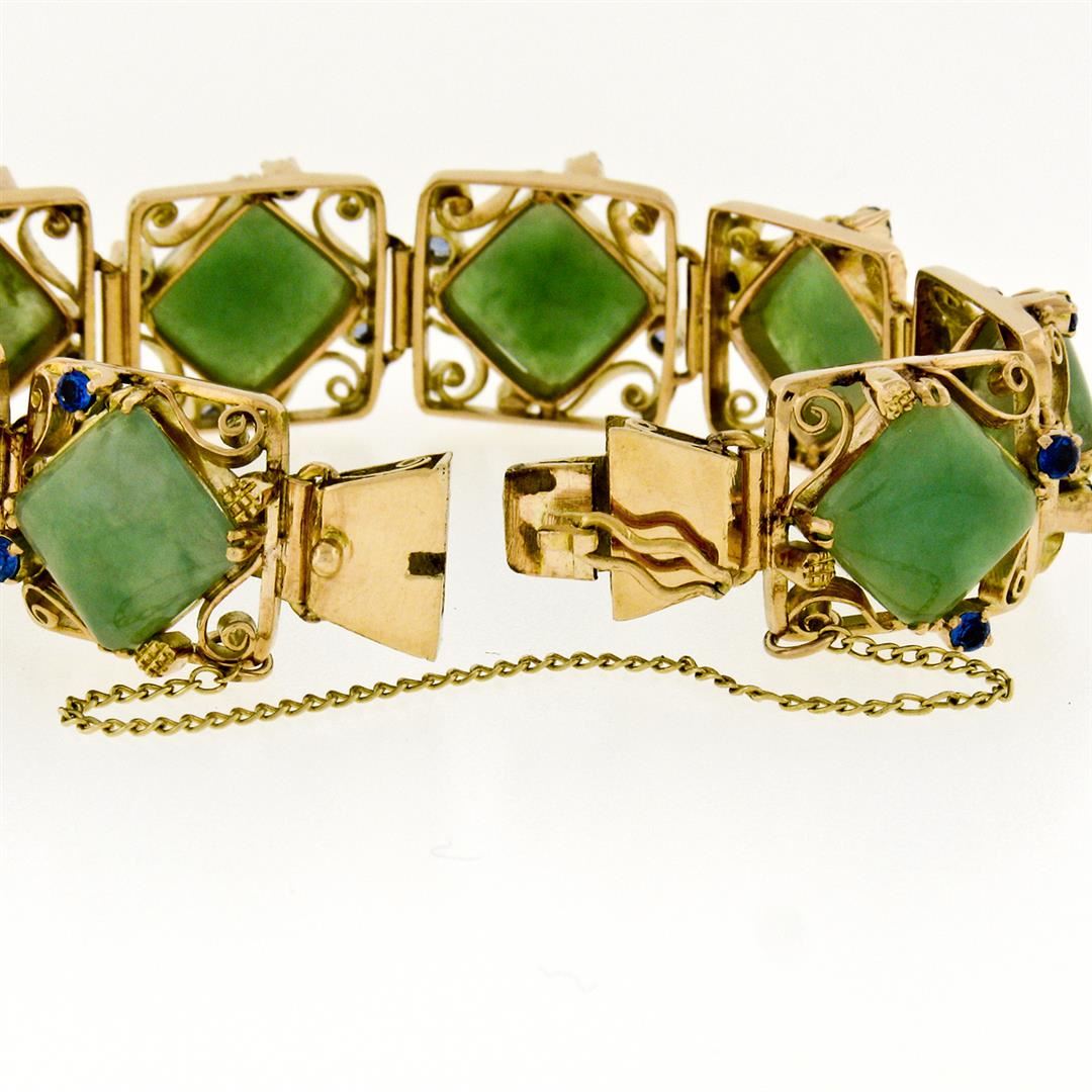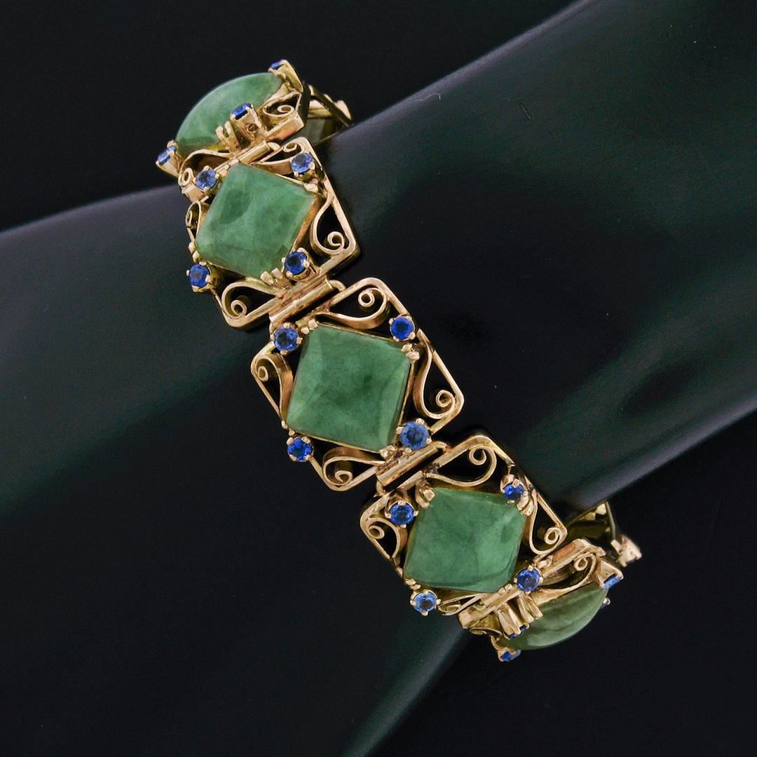 A vintage soldi 14k yellow gold chain bracelet, featuring 9 cushion cabochon cut natural jade (10.30x10.30mm), and 32 round brilliant cut natural sapphires (2.20ctw ). It weighs a total of 32.03 grams, measures 15.60mm wide, and measures 6.25 inches in length.