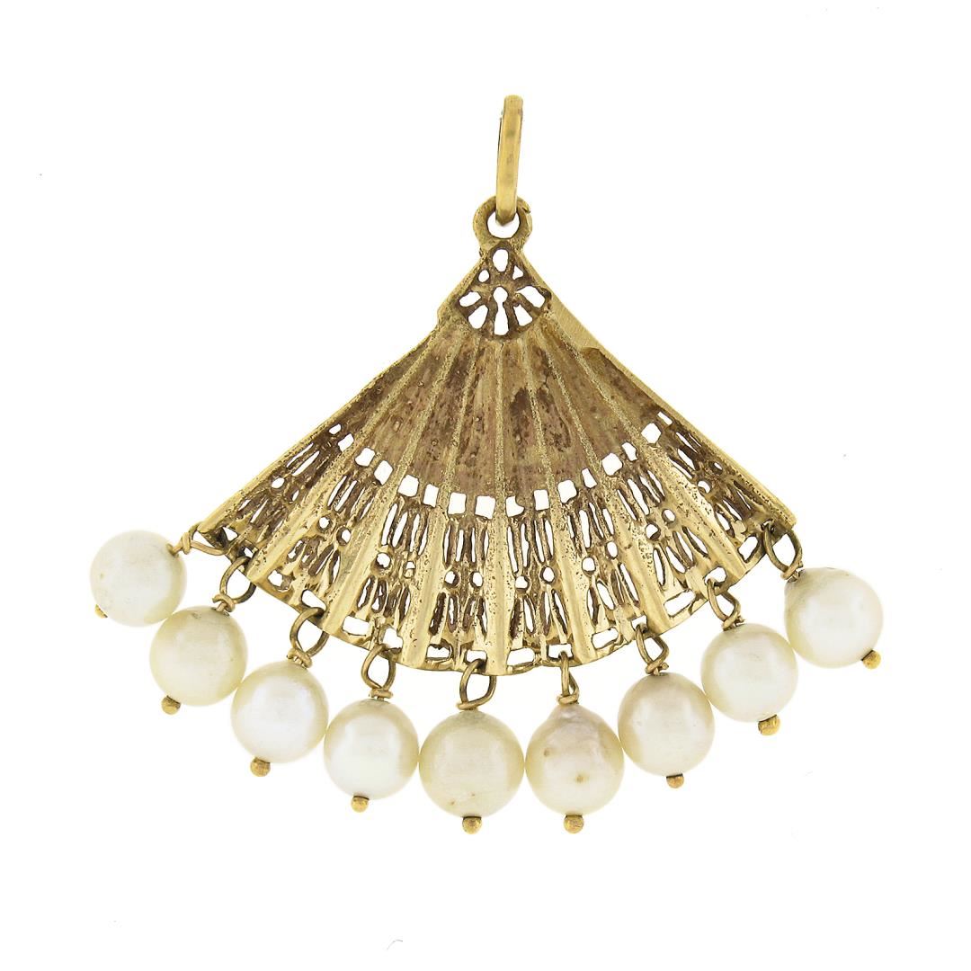 A vintage solid 14k yellow gold pendant, with 9 round bead shape cultured pearls (5mm each). The pendant weighs a total of 5.11 grams, measures 37.8x30.9mm including the bail, and the inside of the bail measures 3.7x2.9mm.