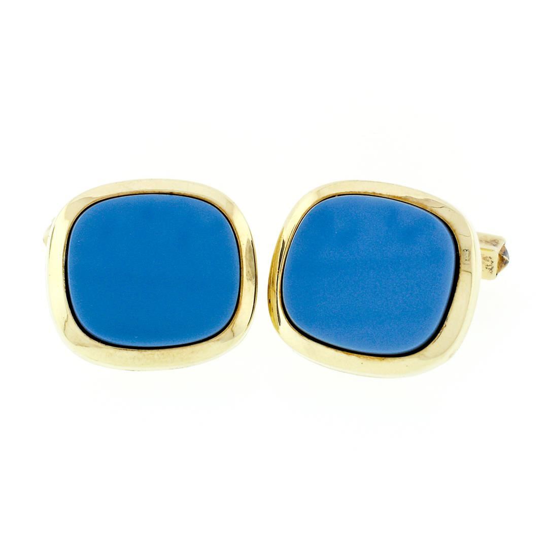 A pair of solid 14k yellow gold cufflinks, with 2 flat cushion cut natural chalcedony (15.62x14.17mm). These cuff links have a Swivel design with a clearance of 12.26mm, weigh a total of 11.23 grams, and the front panels measure 19.52x17.85mm.