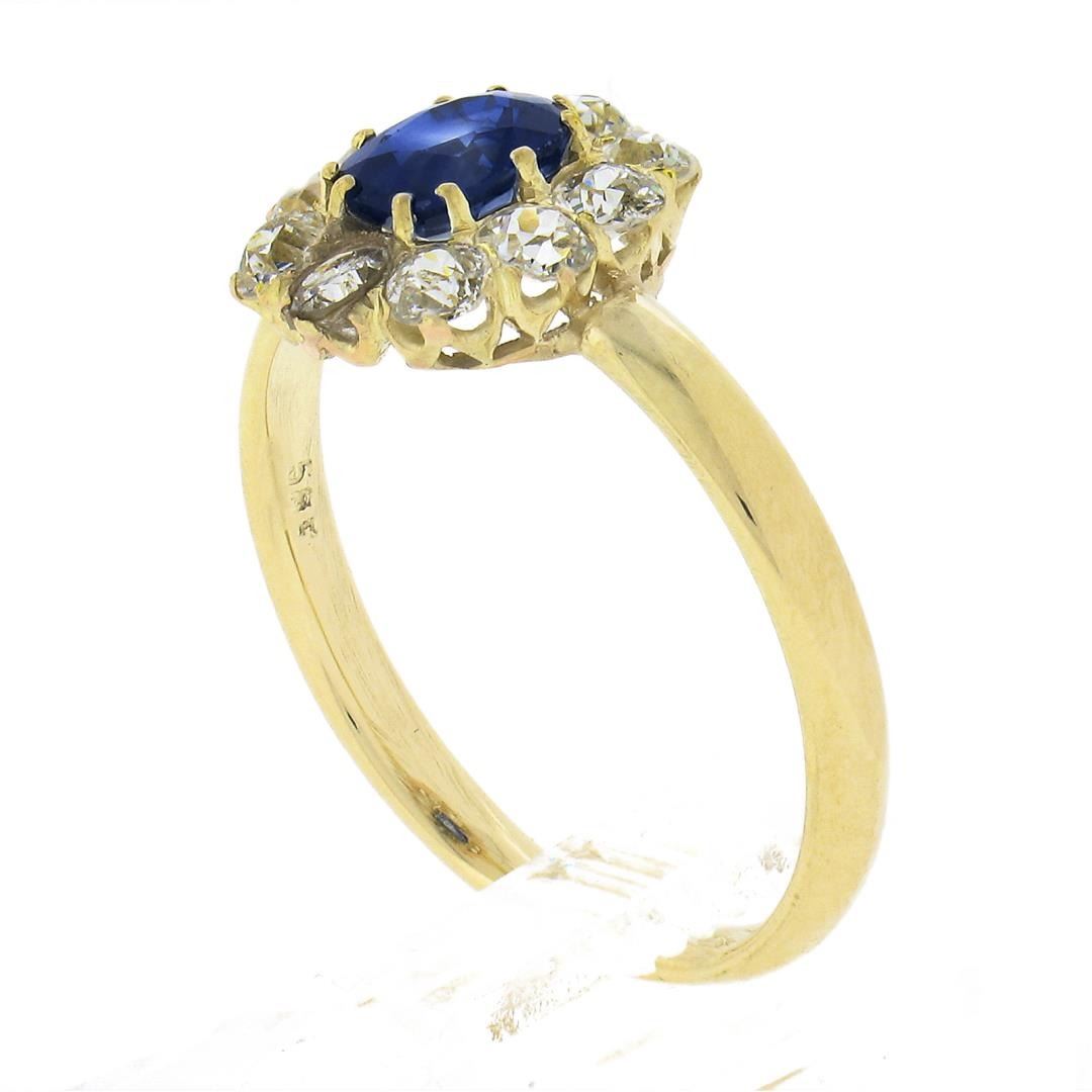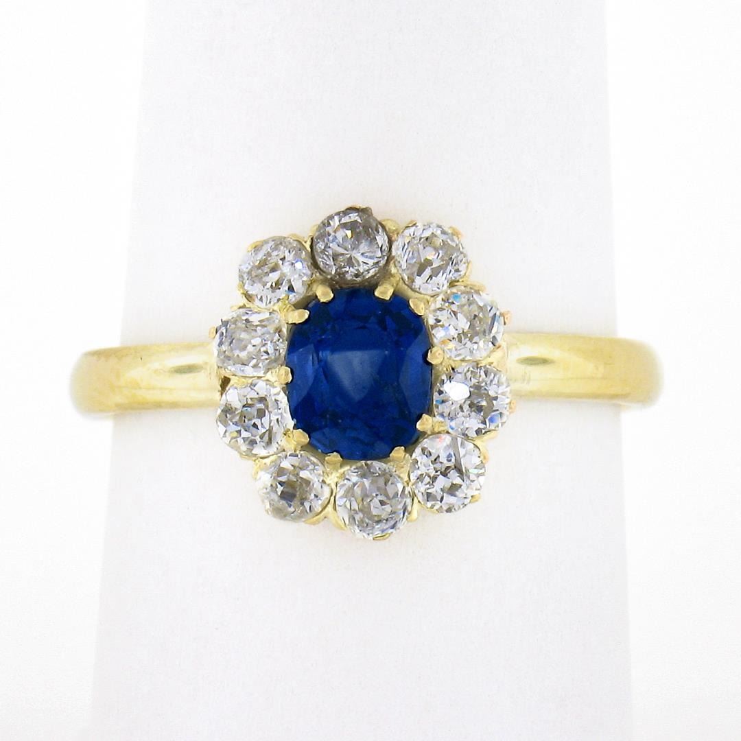 A vintage solid 14k yellow gold ring, with 1 GIA graded cushion cut natural sapphire (0.75ct), with a halo of 10 old european & old mine cut natural diamonds (H/I - SI1/SI2 w/ a few I1 ; 0.70ctw). The ring is size 7.5, weighs a total of 2.66 grams, and measures 11.2mm wide. Comes with all original relevant certifications.