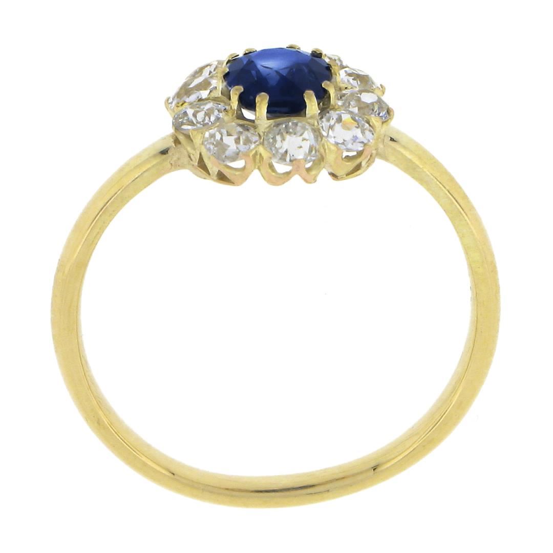A vintage solid 14k yellow gold ring, with 1 GIA graded cushion cut natural sapphire (0.75ct), with a halo of 10 old european & old mine cut natural diamonds (H/I - SI1/SI2 w/ a few I1 ; 0.70ctw). The ring is size 7.5, weighs a total of 2.66 grams, and measures 11.2mm wide. Comes with all original relevant certifications.