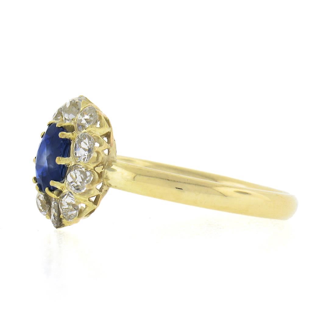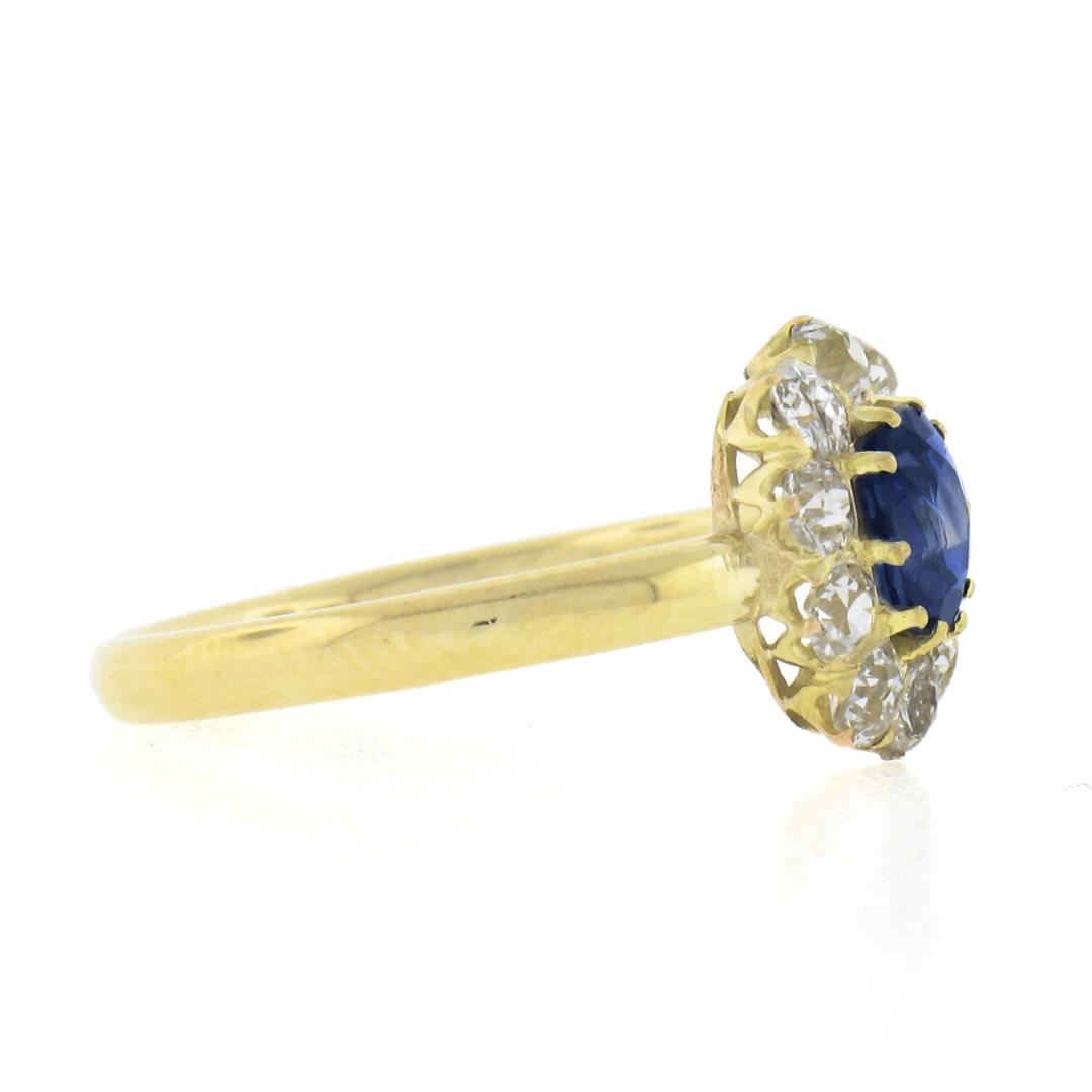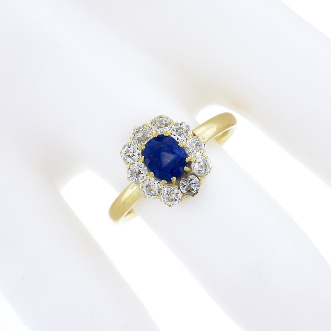 A vintage solid 14k yellow gold ring, with 1 GIA graded cushion cut natural sapphire (0.75ct), with a halo of 10 old european & old mine cut natural diamonds (H/I - SI1/SI2 w/ a few I1 ; 0.70ctw). The ring is size 7.5, weighs a total of 2.66 grams, and measures 11.2mm wide. Comes with all original relevant certifications.
