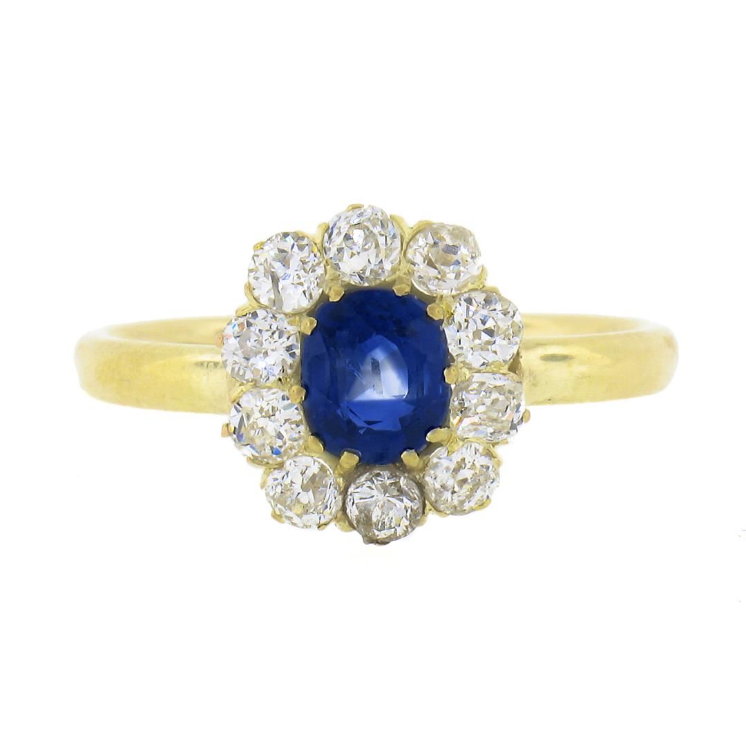 A vintage solid 14k yellow gold ring, with 1 GIA graded cushion cut natural sapphire (0.75ct), with a halo of 10 old european & old mine cut natural diamonds (H/I - SI1/SI2 w/ a few I1 ; 0.70ctw). The ring is size 7.5, weighs a total of 2.66 grams, and measures 11.2mm wide. Comes with all original relevant certifications.