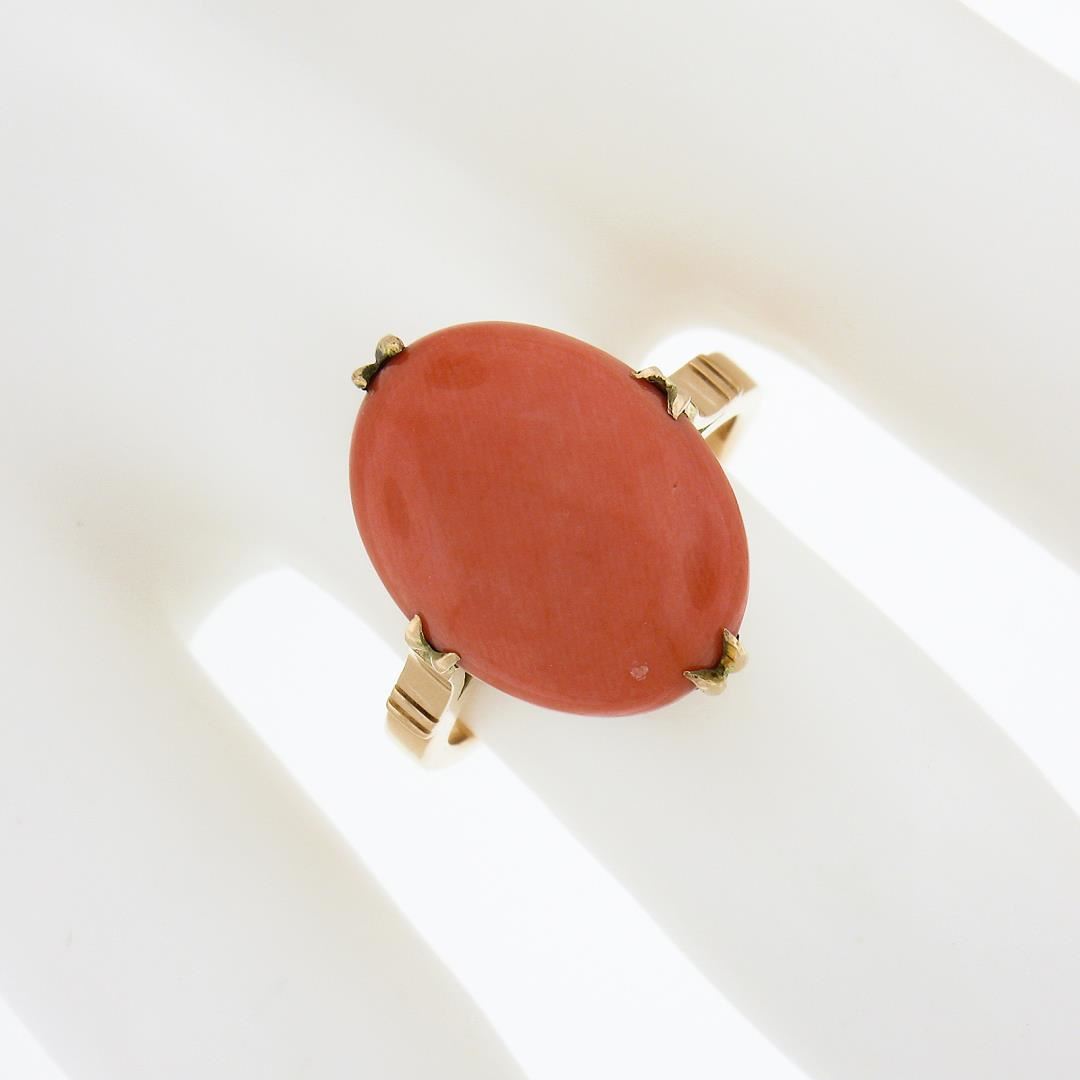 A vintage solid 14k yellow gold ring, with 1 GIA graded oval cabochon cut natural coral (16.35 x 12.10 x 4.72 mm). The ring is size 5.5, weighs a total of 4.86 grams, and measures 17.6mm wide. Comes with all original relevant certifications.