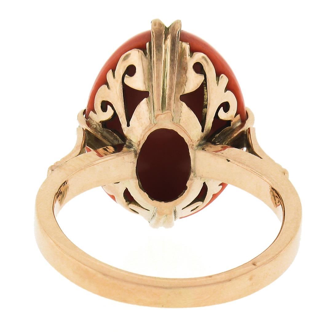 A vintage solid 14k yellow gold ring, with 1 GIA graded oval cabochon cut natural coral (16.35 x 12.10 x 4.72 mm). The ring is size 5.5, weighs a total of 4.86 grams, and measures 17.6mm wide. Comes with all original relevant certifications.