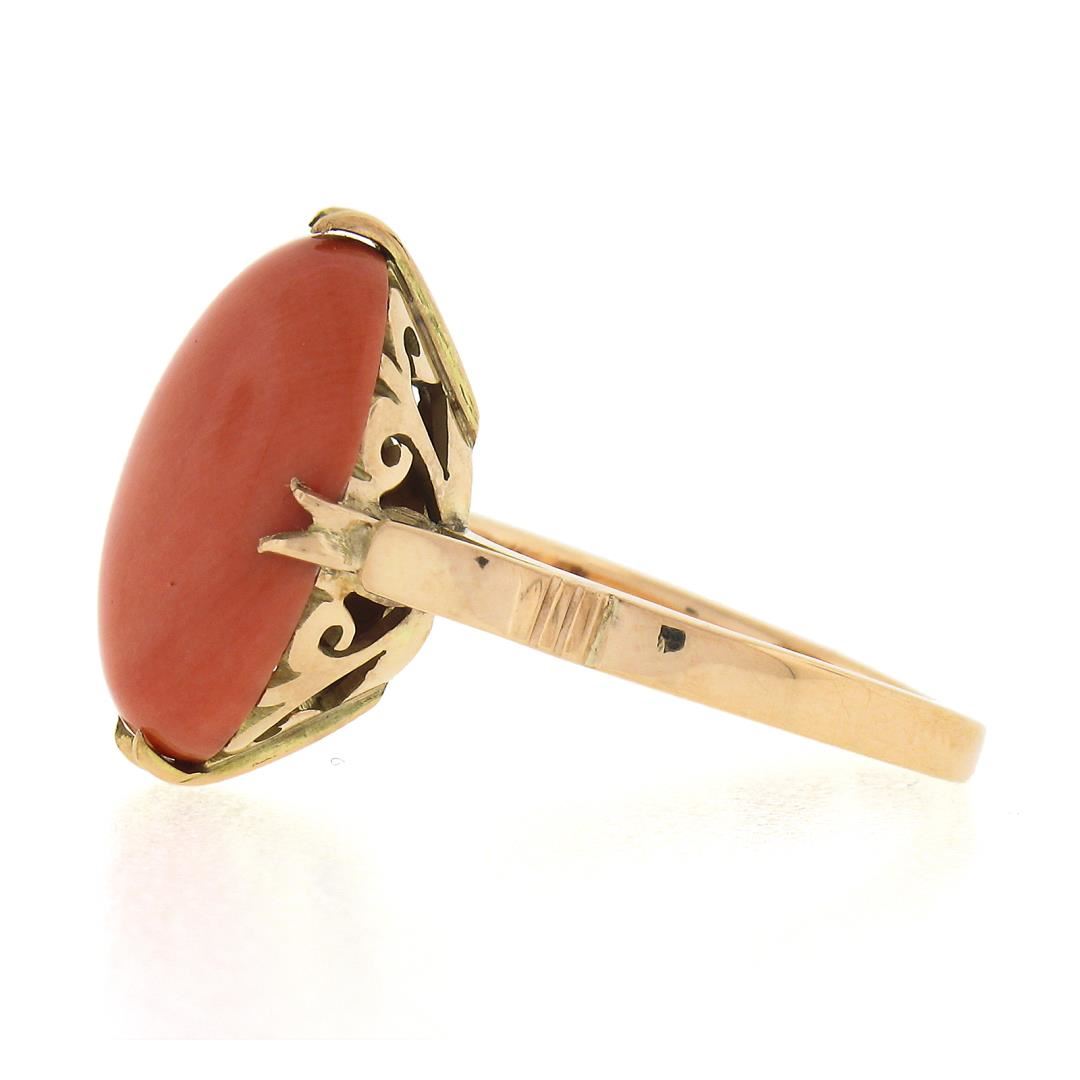 A vintage solid 14k yellow gold ring, with 1 GIA graded oval cabochon cut natural coral (16.35 x 12.10 x 4.72 mm). The ring is size 5.5, weighs a total of 4.86 grams, and measures 17.6mm wide. Comes with all original relevant certifications.