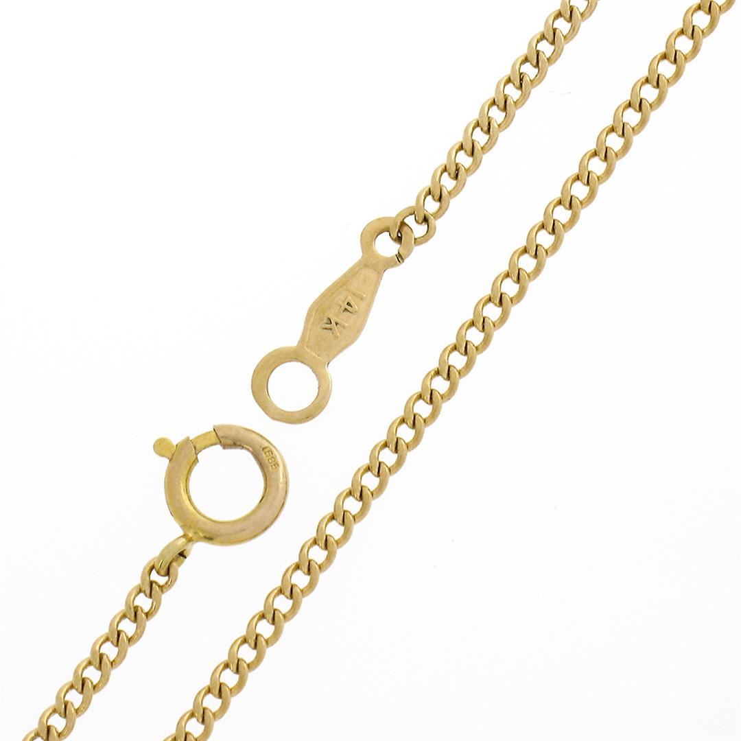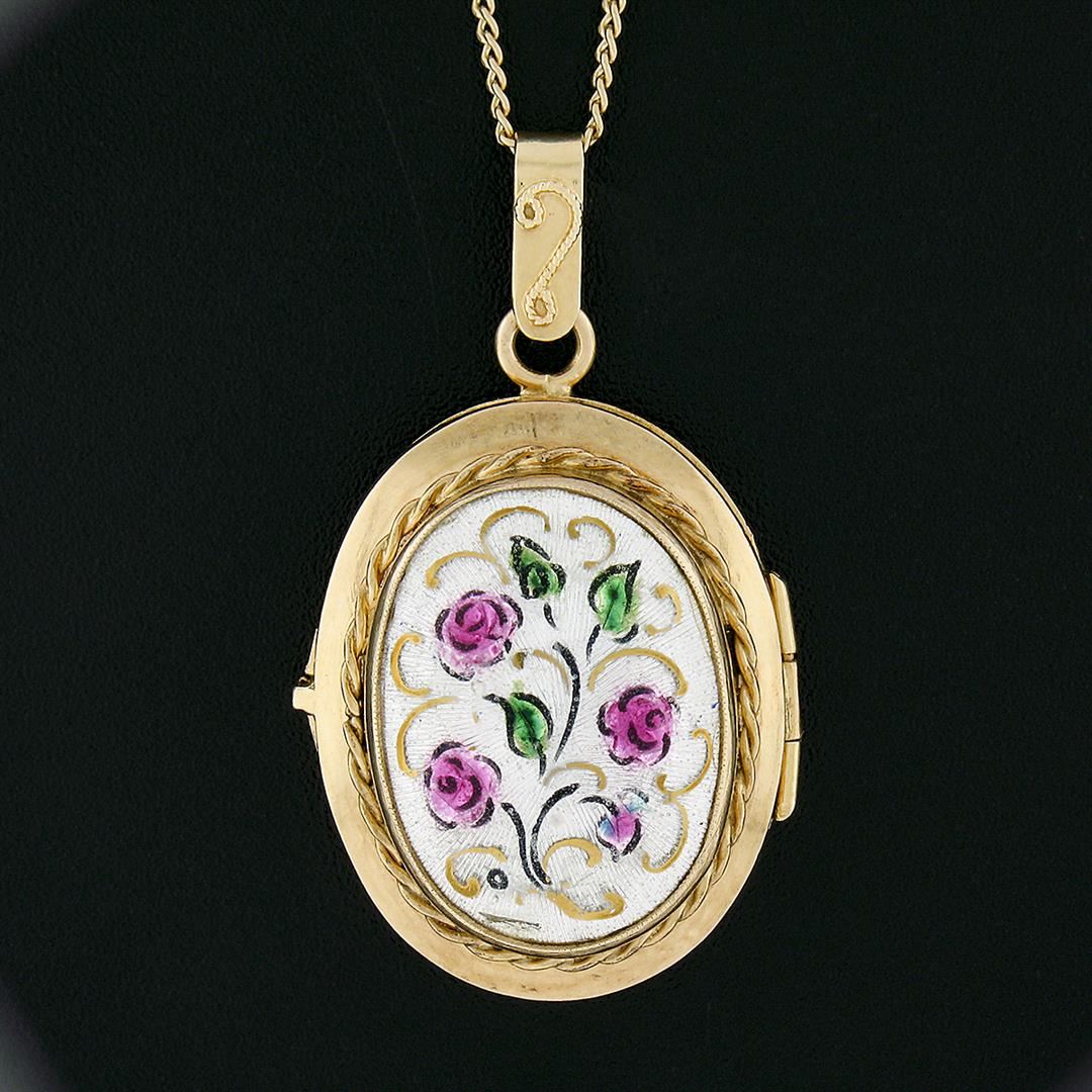 A vintage solid 14k yellow gold locket pendant necklace, with enamel work. The pendant weighs a total of 12.86 grams, measures 40.90x24mm including the bail, and 20 inch curb link chain.