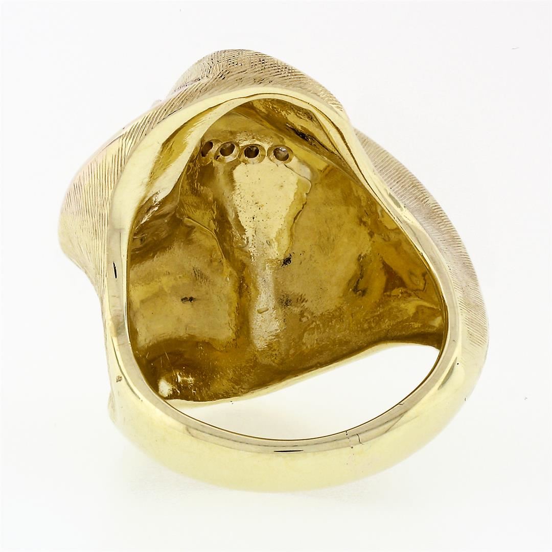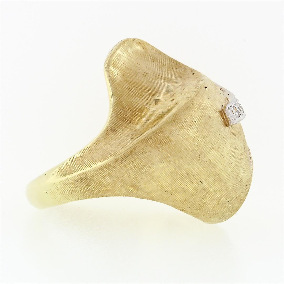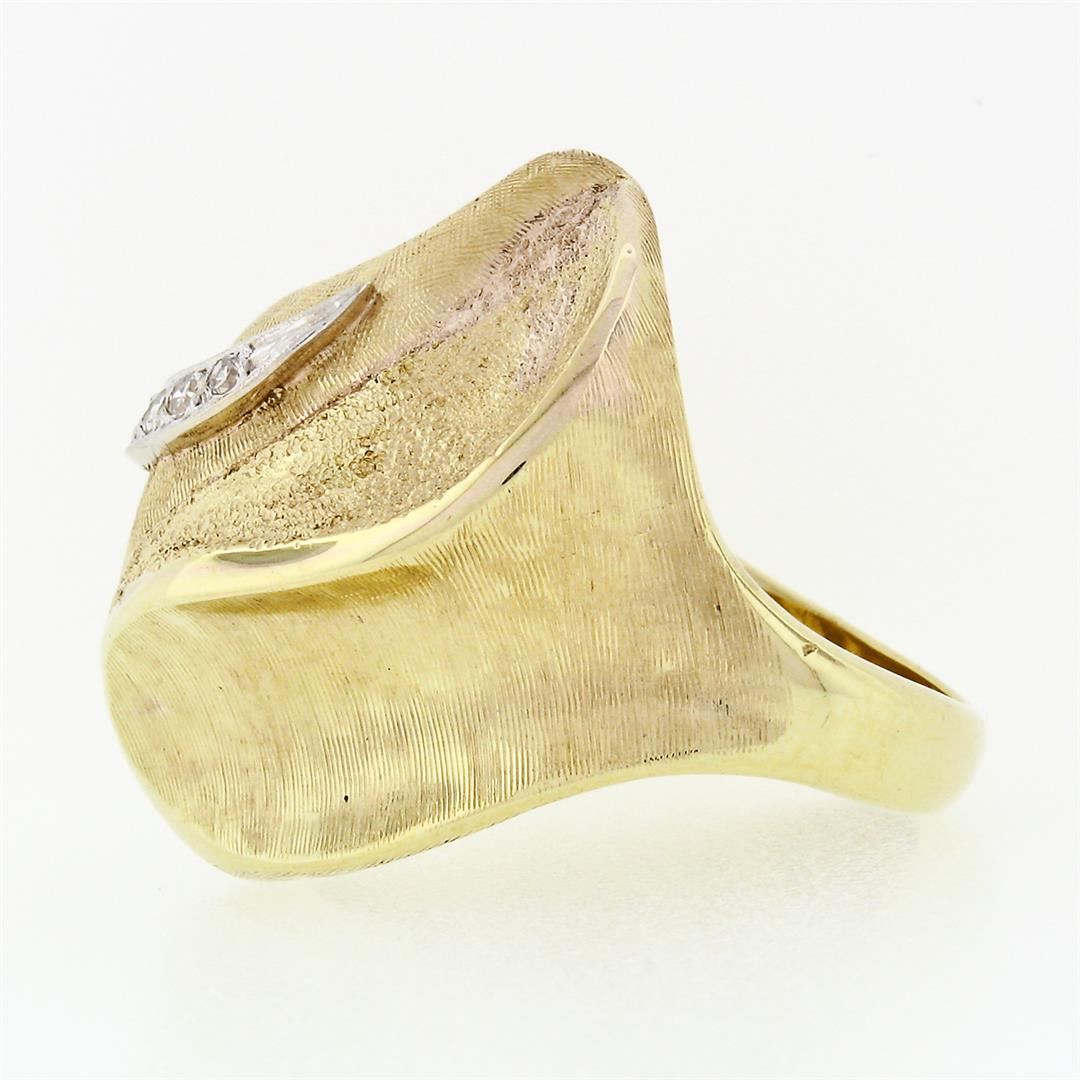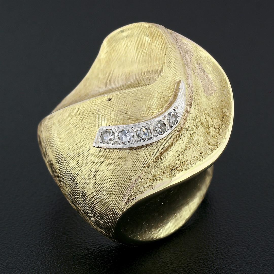 A solid 14k yellow gold Florentine finish ring, with 5 single cut natural diamonds (F - VS1 ; 0.10ctw). The ring is size 7.5, weighs a total of 17.40 grams, and measures 26.7mm wide.