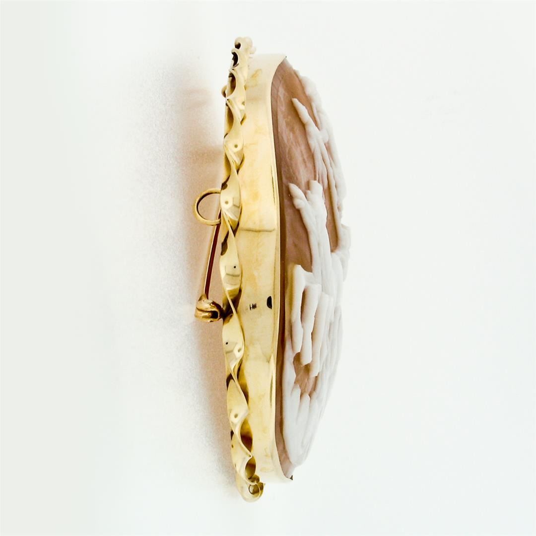 A vintage solid 14k yellow gold brooch, with 1 oval shape carved natural shell cameo (74.5x56.5mm). Measures 62.6x80.1mm and weighs a total of 24.50 grams.