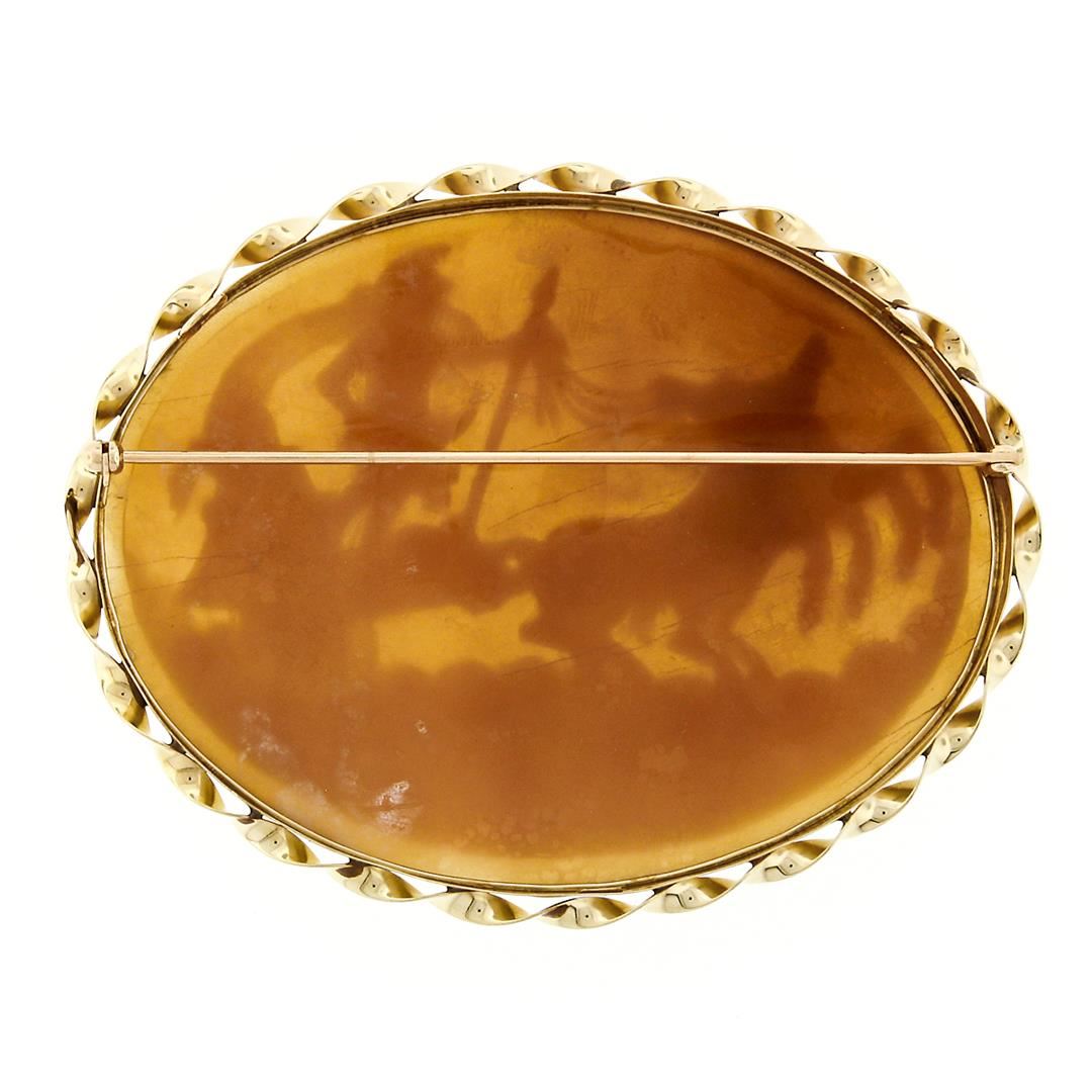 A vintage solid 14k yellow gold brooch, with 1 oval shape carved natural shell cameo (74.5x56.5mm). Measures 62.6x80.1mm and weighs a total of 24.50 grams.