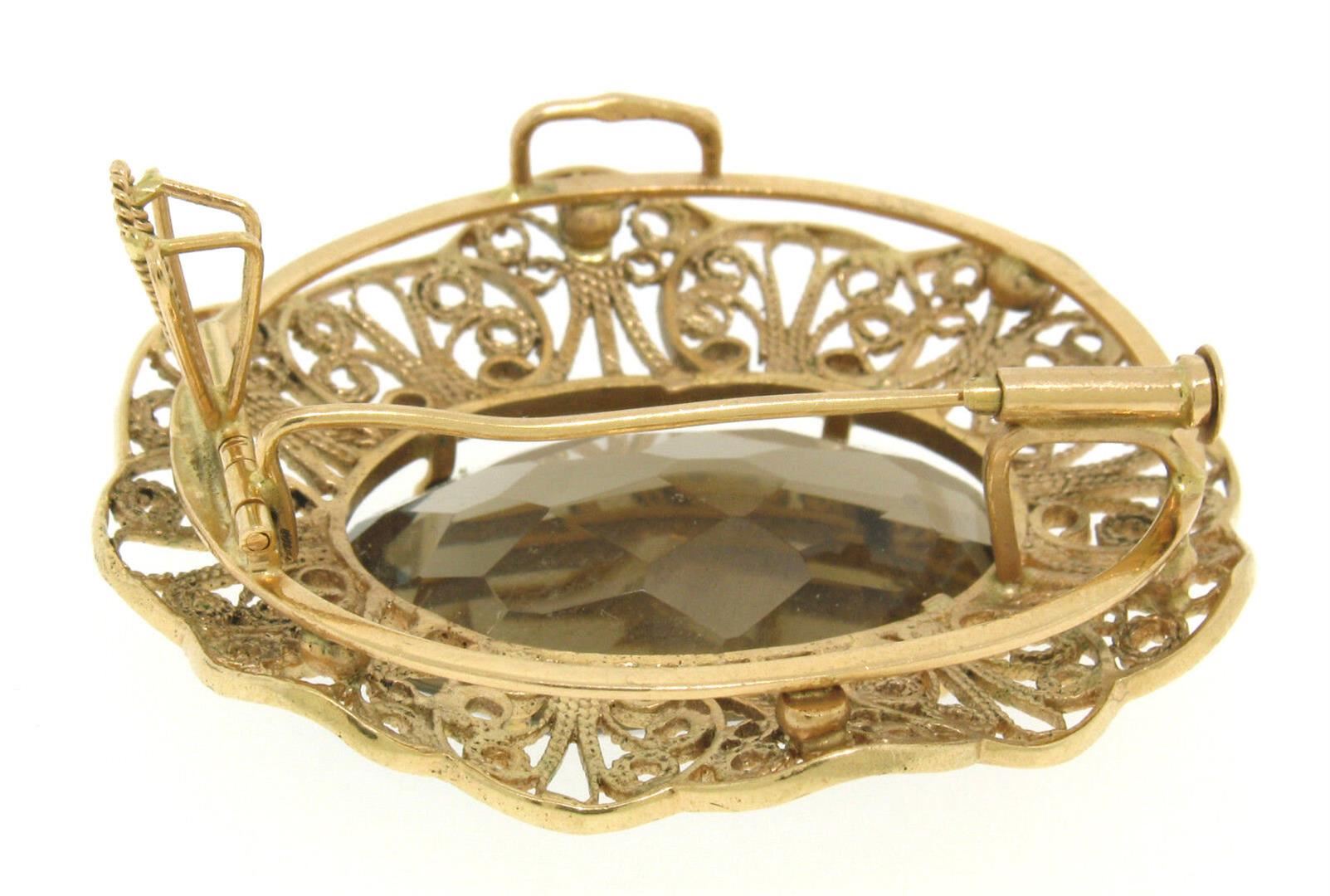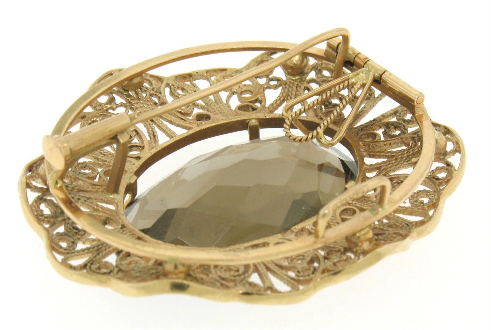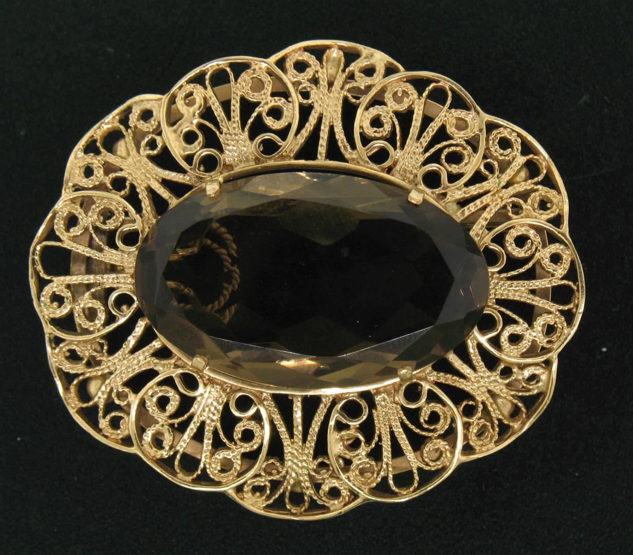 A vintage solid 14k yellow gold pin brooch, featuring 1 faceted oval cut smokey topaz (30.33X18.49mm - 35.00ct). Measures 41.75x48.30mm and weighs a total of 18.80 grams.