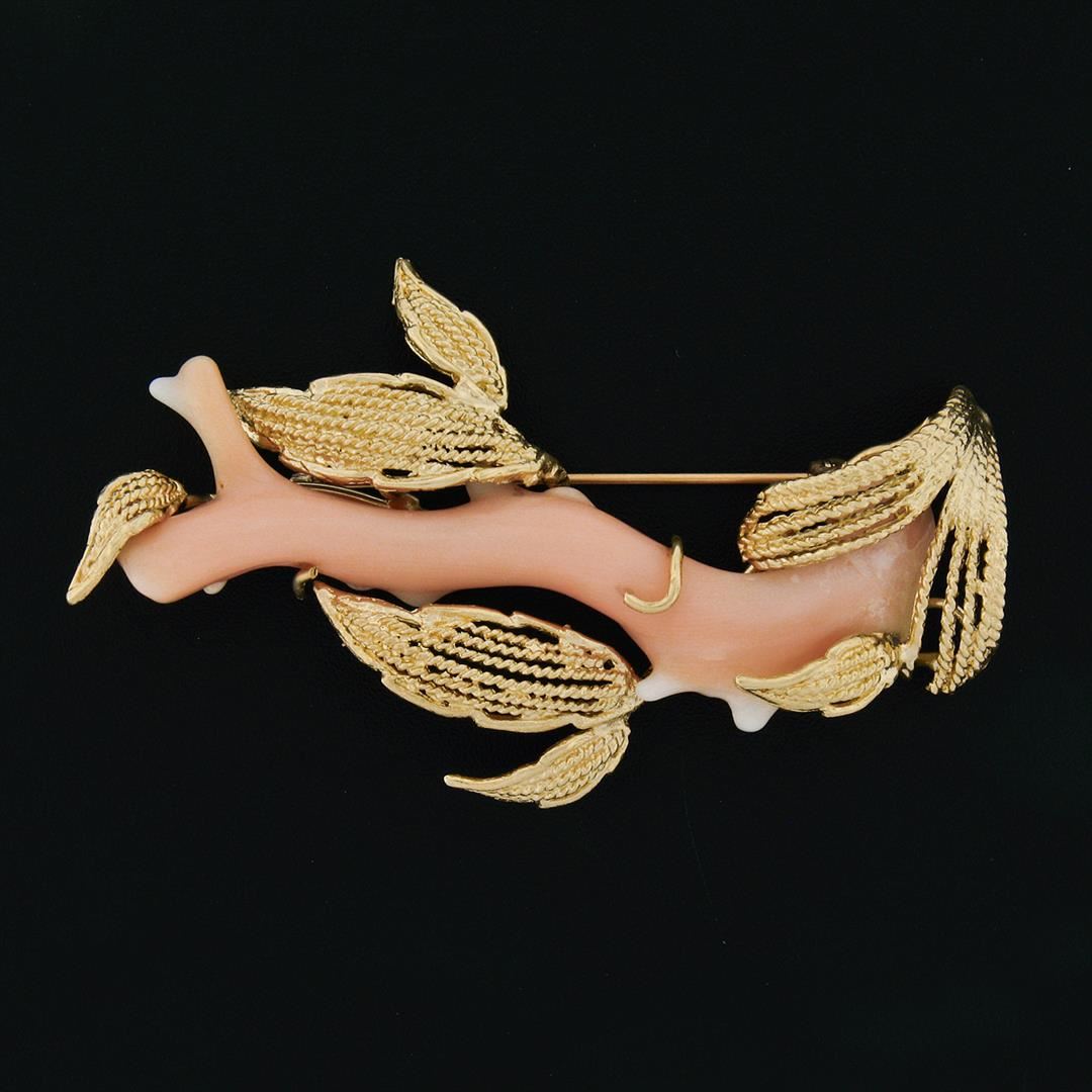 A vintage 14k yellow gold brooch featuring a piece of natural angel skin coral and twisted wire work. Measures 67.0x40.8mm and weighs a total of 17.22 grams.