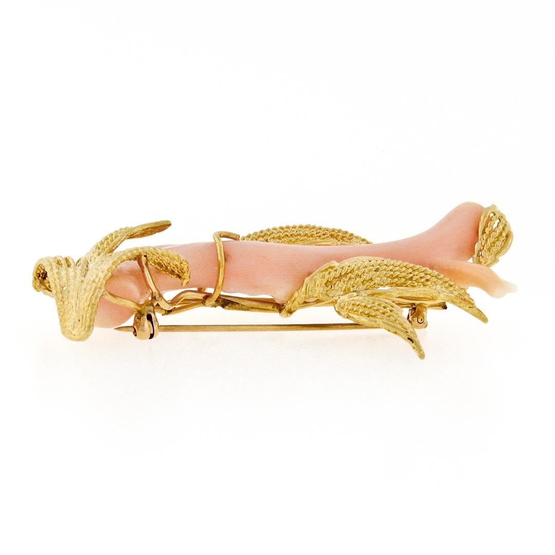 A vintage 14k yellow gold brooch featuring a piece of natural angel skin coral and twisted wire work. Measures 67.0x40.8mm and weighs a total of 17.22 grams.
