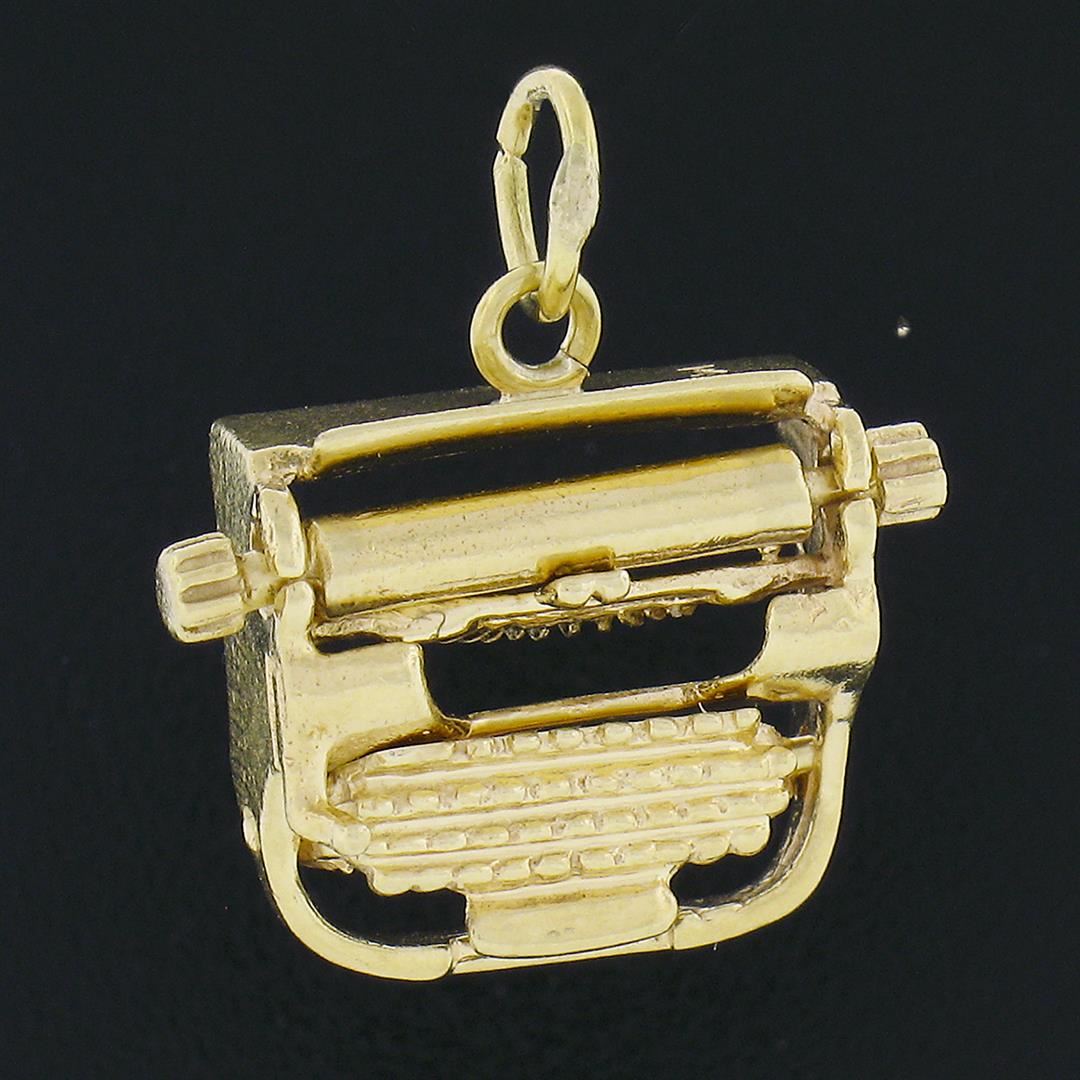 A vintage solid 14k yellow gold mechanical detailed typewriter pendant charm. The pendant weighs a total of 3.24 grams, measures 19.90x17.60mm including the bail, and the inside of the bail measures 3.5x3.1mm.