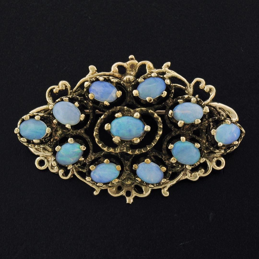 A vintage 14k yellow gold marquise shaped brooch or pendant prong set with 11 oval cabochon cut opals (Center: 5.75x4.00; Outside: 5.0x3.8mm). The pendant weighs a total of 11.34 grams, measures 39.25x25.90mm, and the inside of the bail measures 2.8x4.2mm
