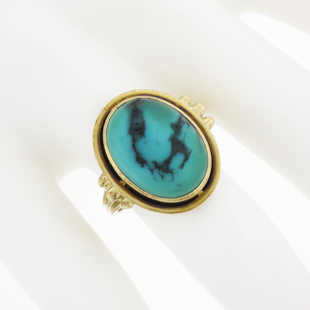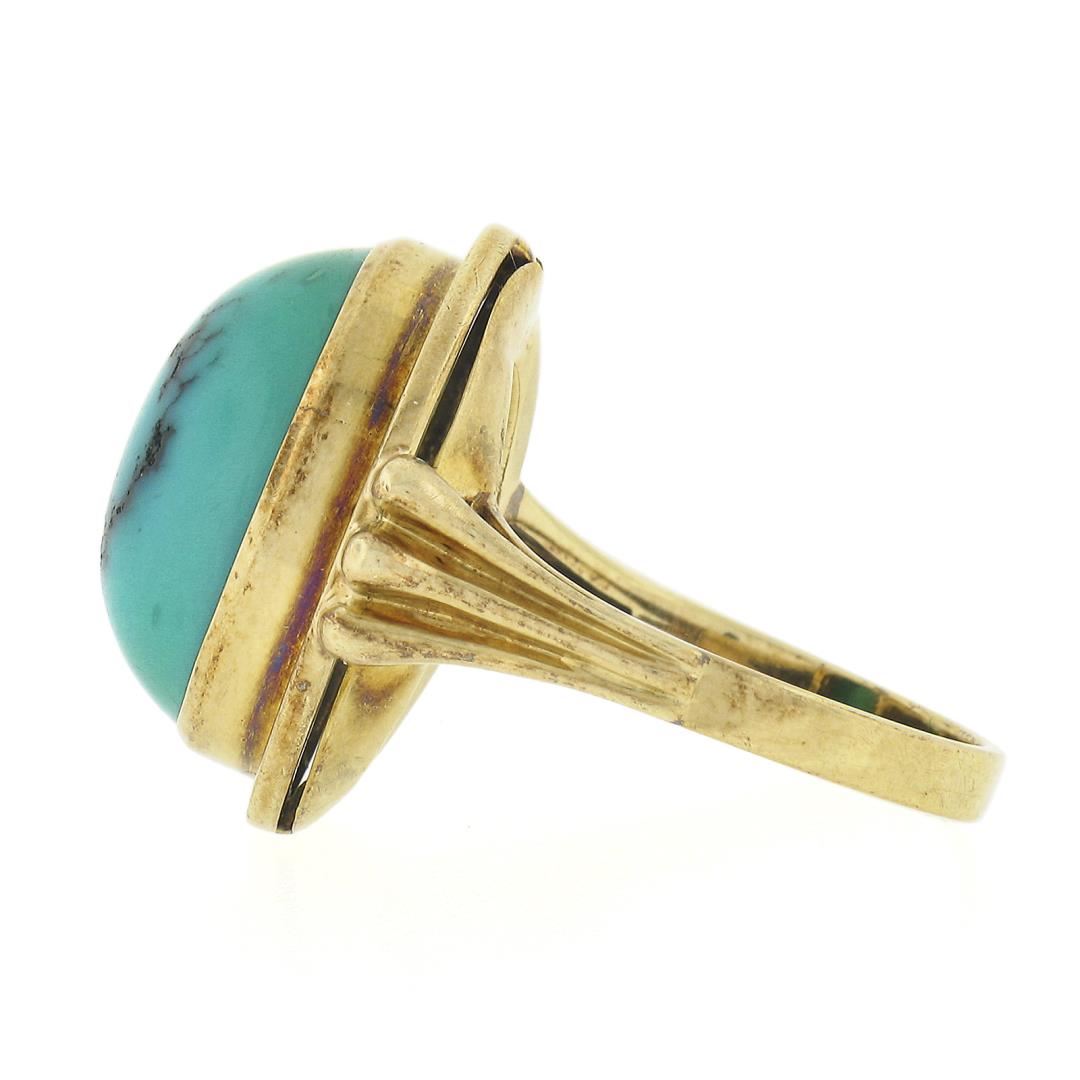 a vintage solid 14k yellow gold ring, with 1 oval cabochon cut natural turquoise (15.9x12mm). The ring is size 7.0, weighs a total of 6.46 grams, and measures 20.1mm wide.