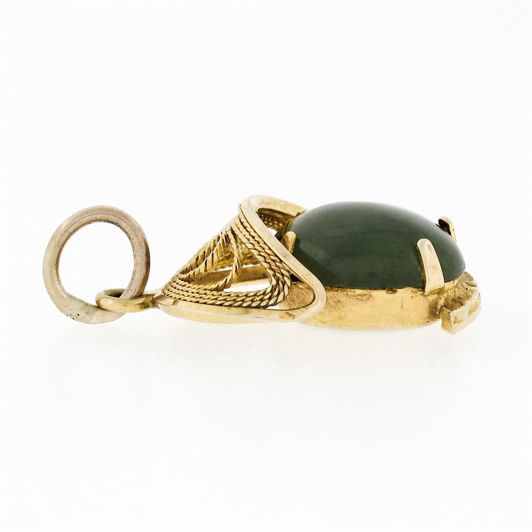 A vintage solid 14 yellow gold pendant, with oval cabochon cut natural jade (10.15x8.2mm). The pendant weighs a total of 1.7 grams, measures 24.55x12mm including the bail, and the inside of the bail measures 3.50x3.65mm.