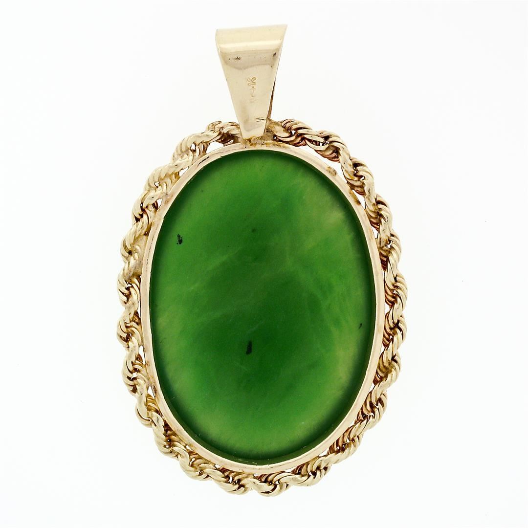 A vintage 14k yellow gold pendant, with oval cabochon cut natural jade (26.1x18.75mm). The pendant weighs a total of 8.30 grams, measures 40.8x25.3mm including the bail, and the inside of the bail measures 7x4.1mm.