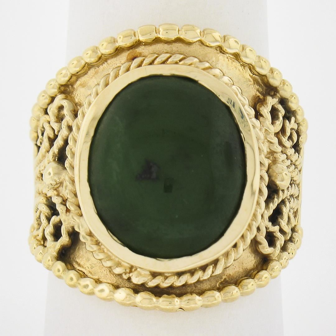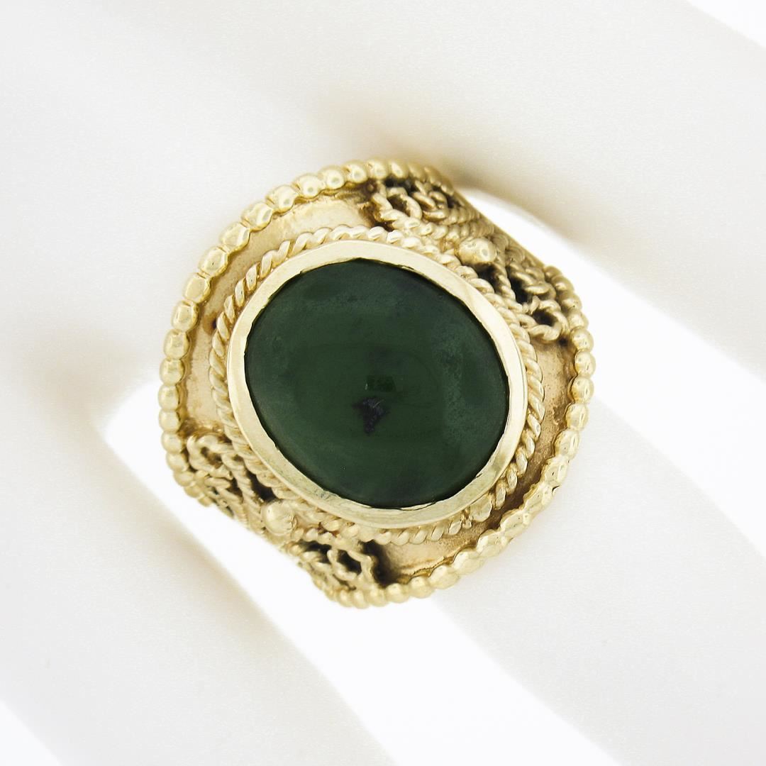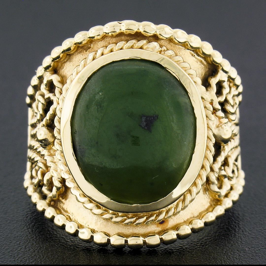 A vintage solid 14k yellow gold cigar band ring, with 1 oval cabochon cut natural jade (13.5x11.4mm). The ring is size 7.0, weighs a total of 11.86 grams, and measures 21.9mm wide.