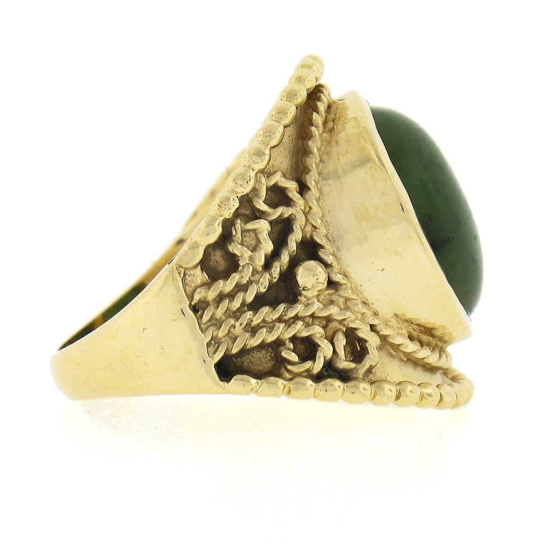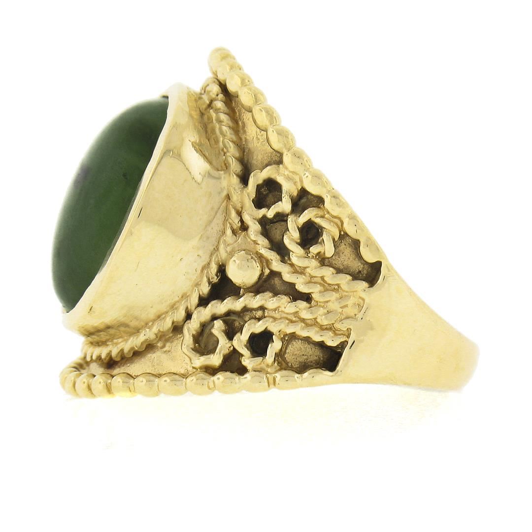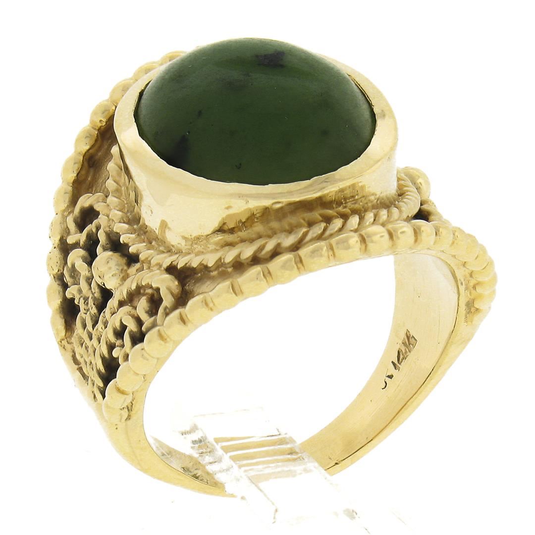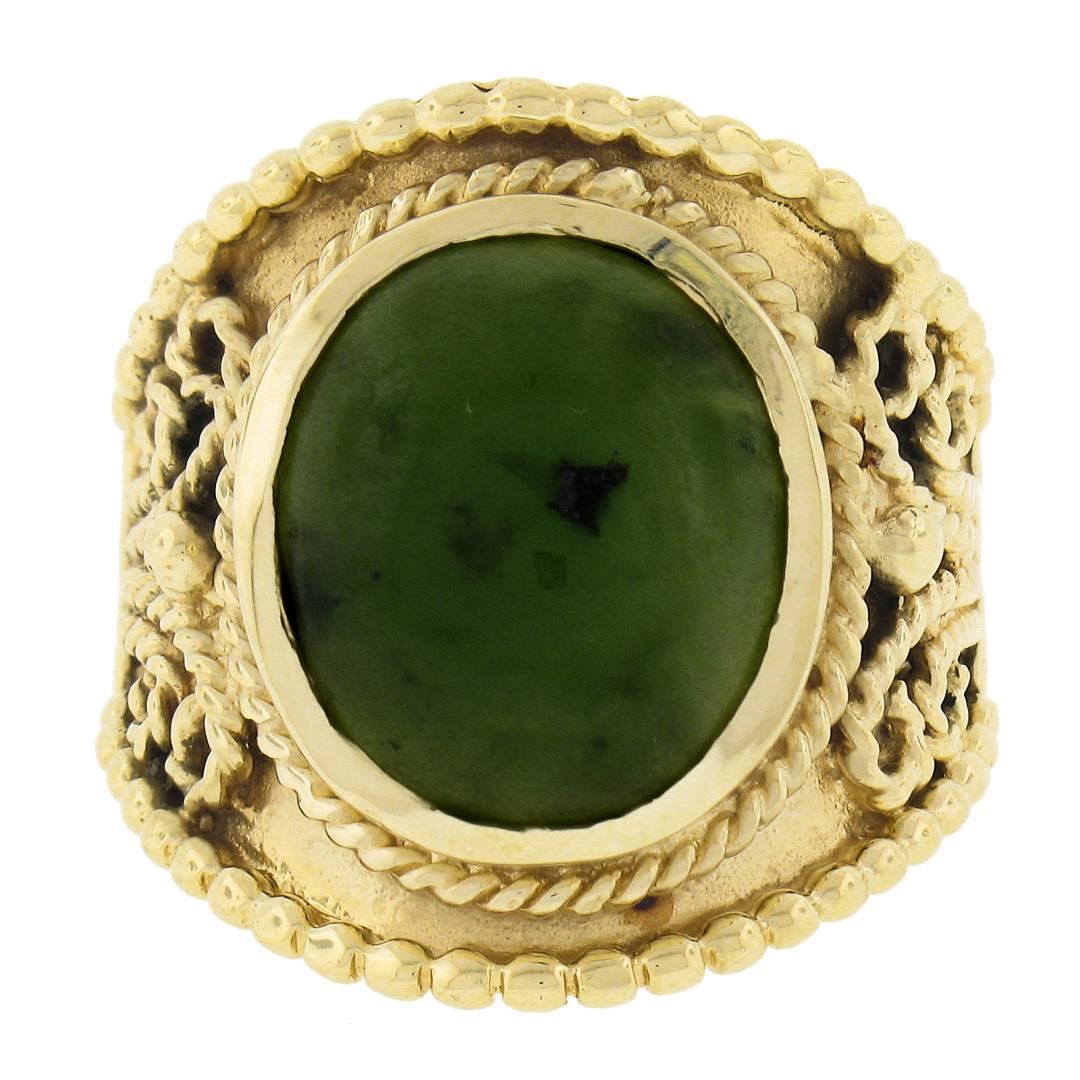 A vintage solid 14k yellow gold cigar band ring, with 1 oval cabochon cut natural jade (13.5x11.4mm). The ring is size 7.0, weighs a total of 11.86 grams, and measures 21.9mm wide.